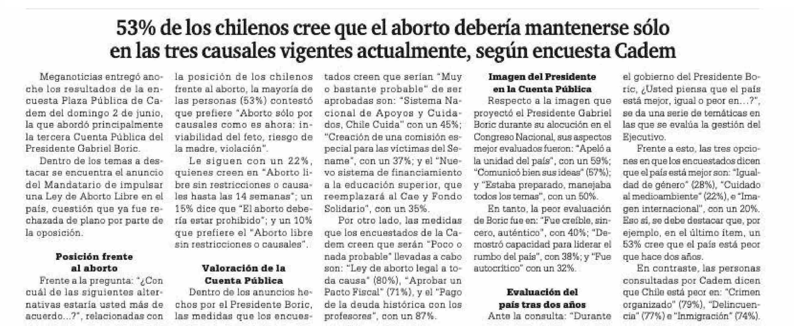 | Título: | 53% de los chilenos cree que el aborto debería mantenerse sólo en las tres causales vigentes actualmente, según encuesta Cadem |