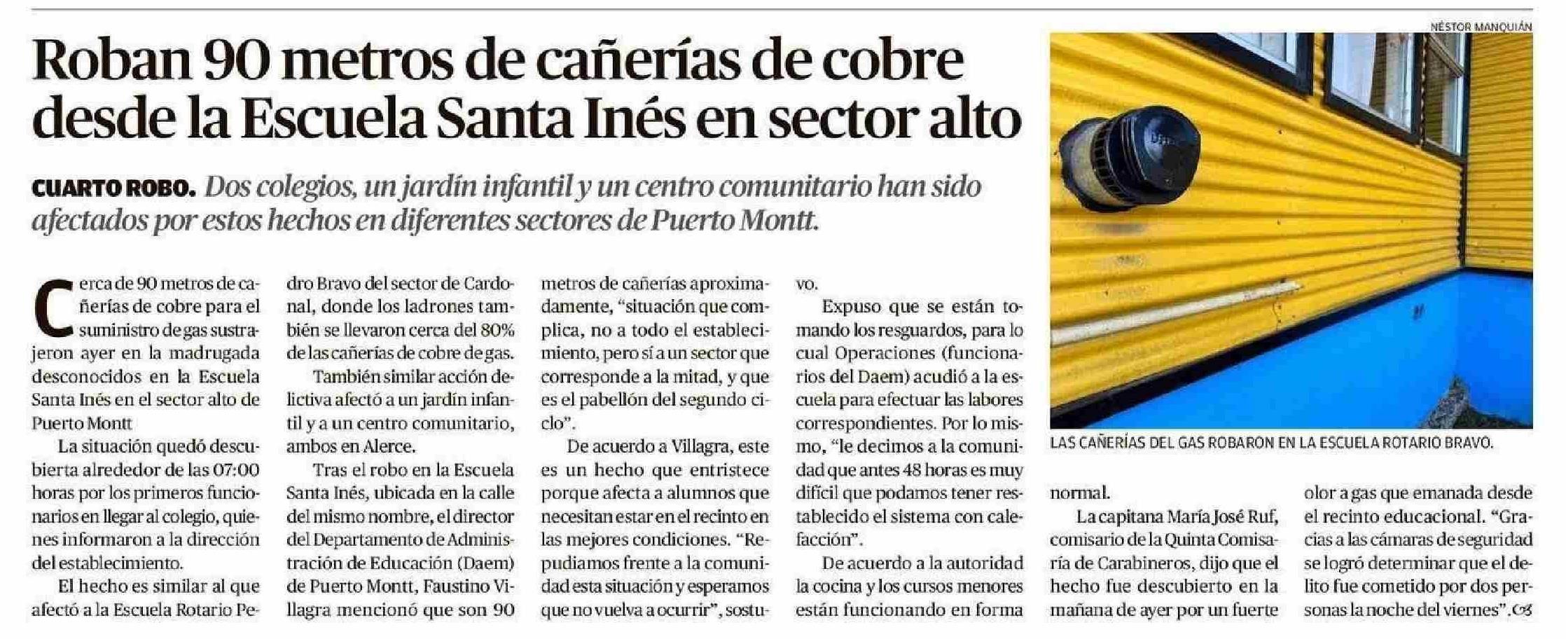 Roban 90 metros de cañerías de cobre desde la Escuela Santa Inés en sector alto
