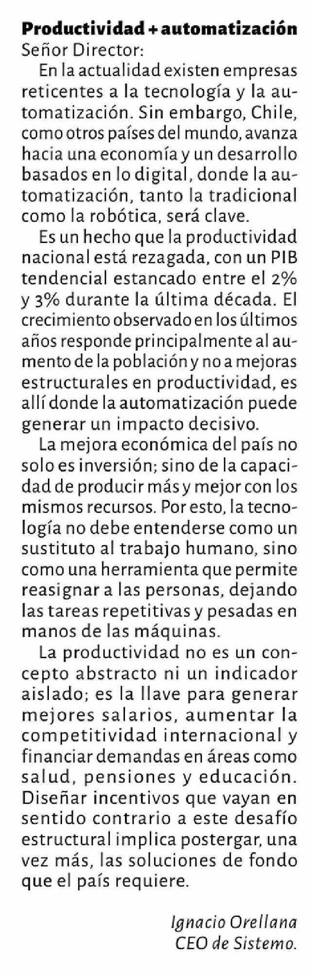| Título: | Cartas: Productividad + automatización Señor Director: En la actualidad existen empresas reticentes a la tecnología y la automatización. Sin embargo, Chile, como otros países del mundo, avanza hacia una economía y un desarrollo basados en lo digital, donde la automatización, tanto la tradicional com |