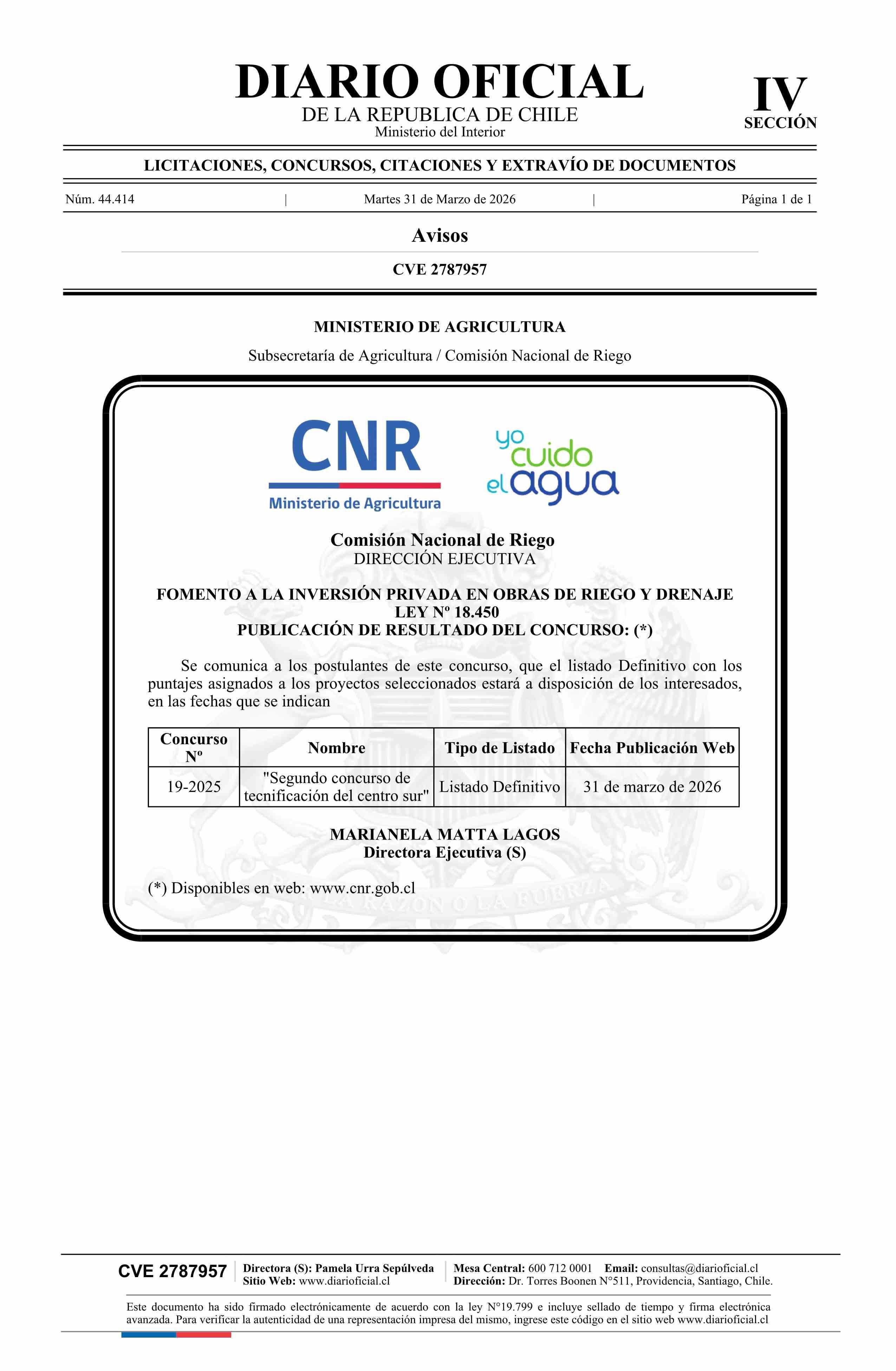 | Título: | AVISO LICITACIONES: Fomento a la inversión privada en obras de riego y drenaje ley Nº 18.450 |