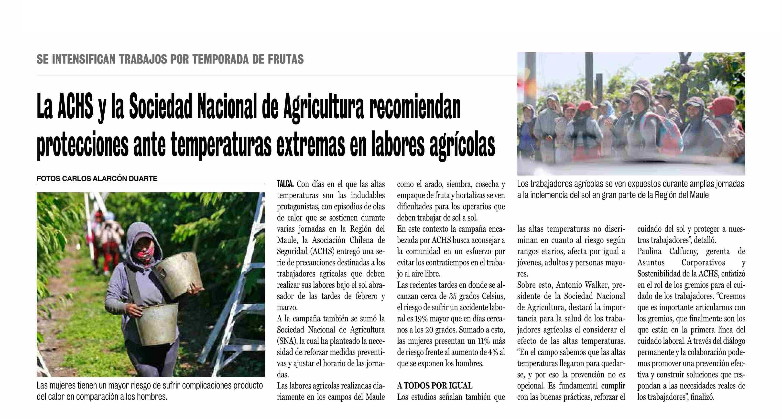 La ACHS y la Sociedad Nacional de Agricultura recomiendan protecciones ante temperaturas extremas en labores agrícolas
