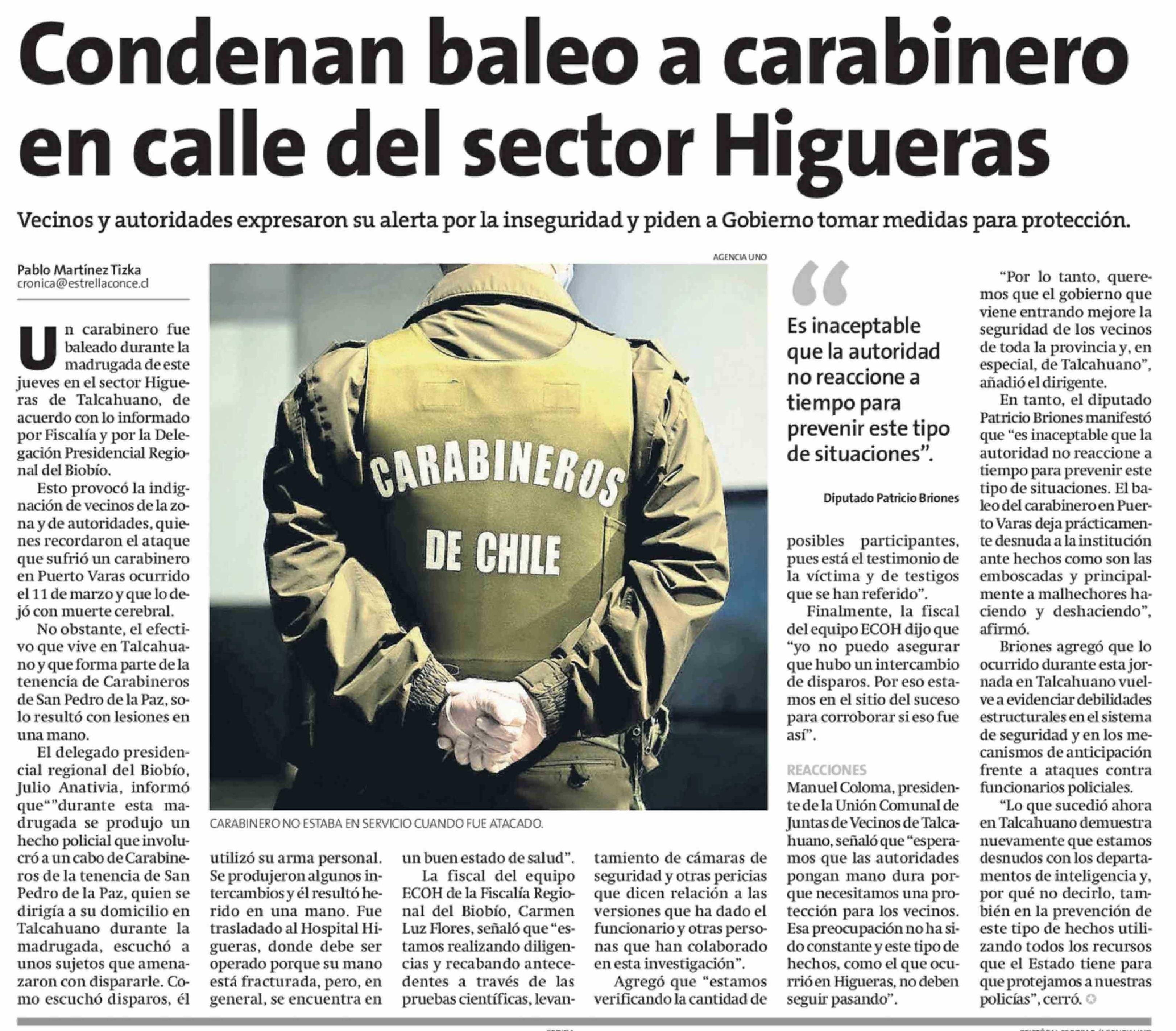 Condenan baleo a carabinero en calle del sector Higueras
