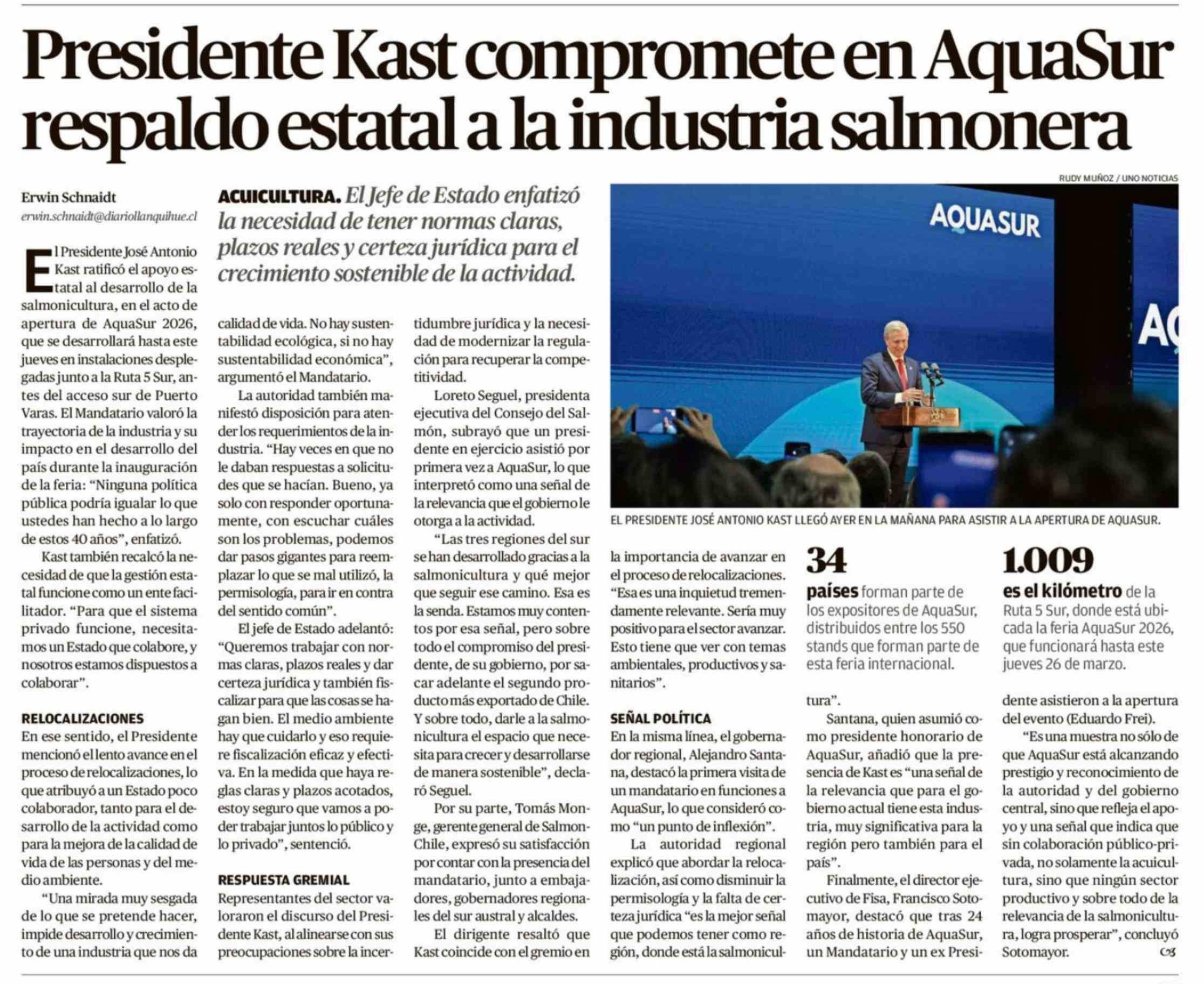 Presidente Kast compromete en AquaSur respaldo estatal a la industria salmonera