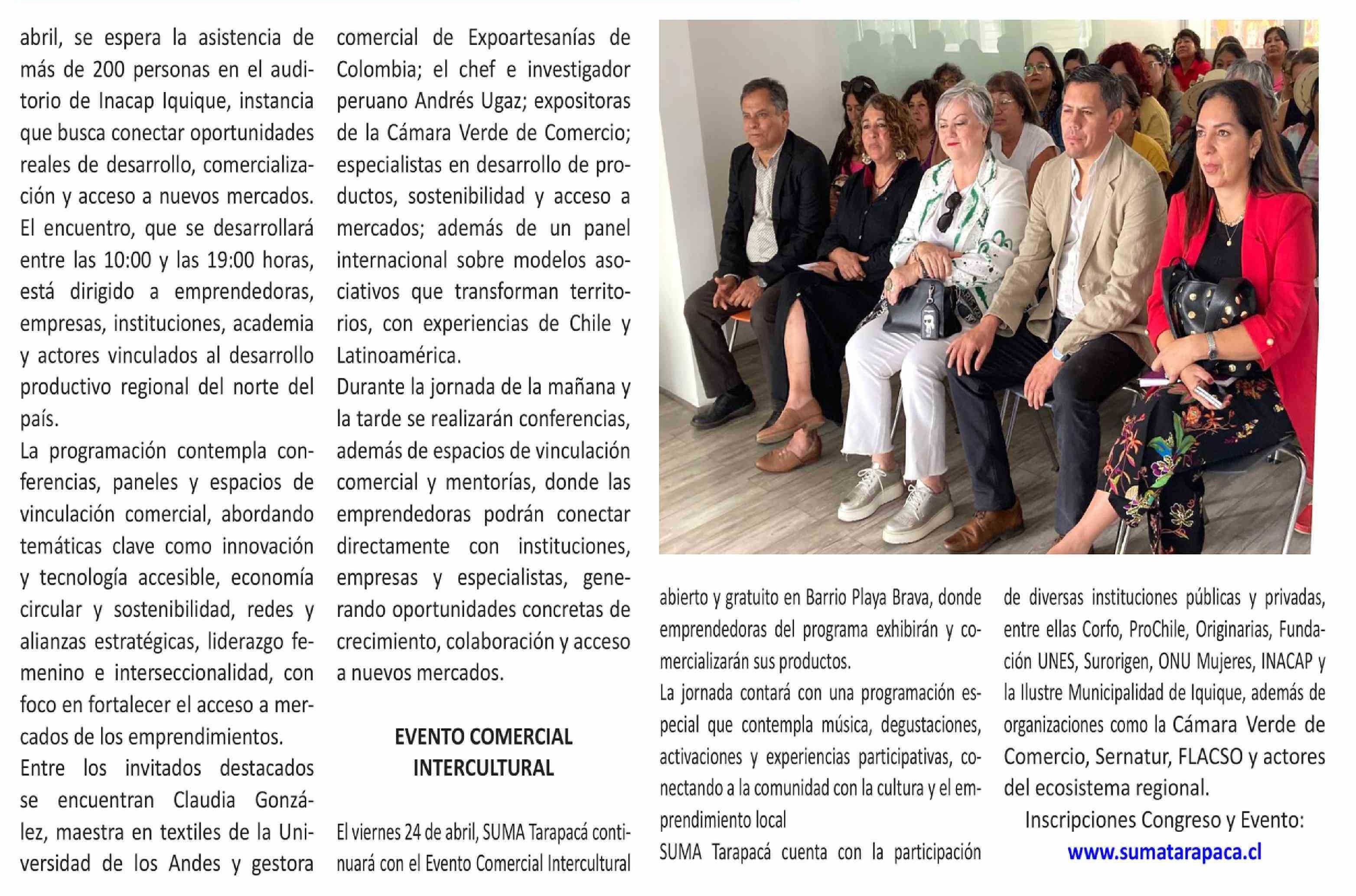 Título: abril, se espera la asistencia de más de 200 personas en el auditorio de Inacap Iquique, instancia que busca conectar oportunidades reales de desarrollo, comercialización y acceso a nuevos mercados. El encuentro, que se desarrollará entre las 10:00 y las 19:00 horas, está dirigido a emprendedoras, e
