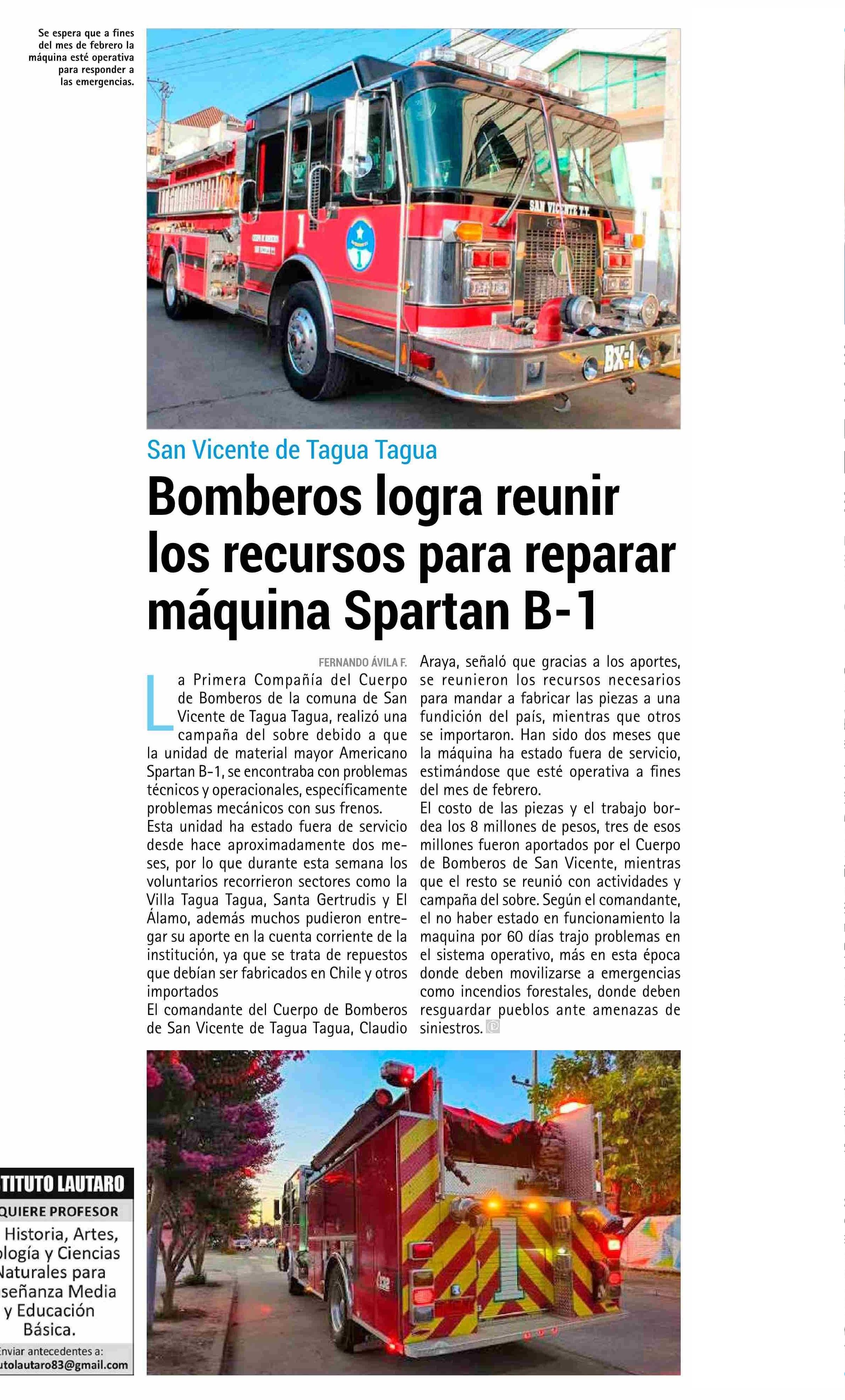 Bomberos logra reunir los recursos para reparar máquina Spartan B-1