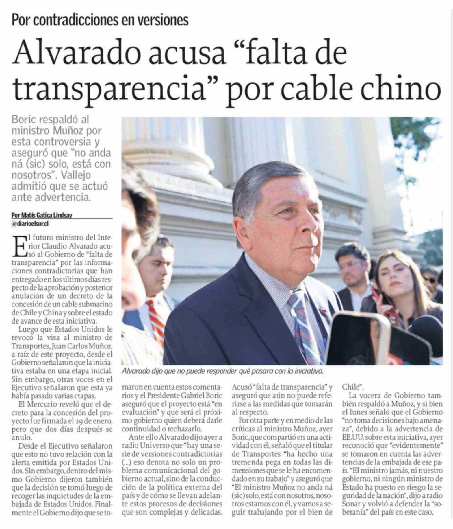 Alvarado acusa "falta de transparencia" por cable chino