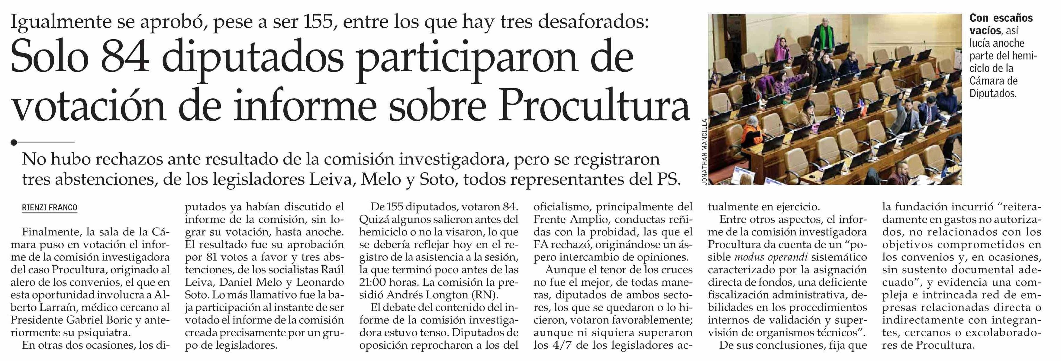 Solo 84 diputados participaron de votación de informe sobre Procultura
