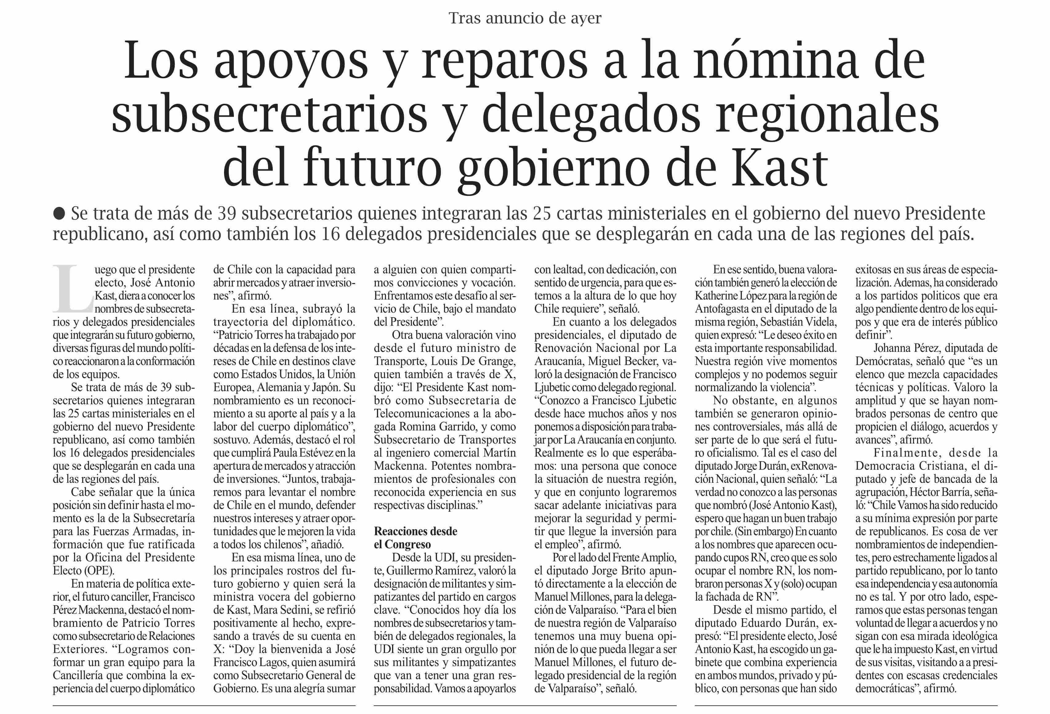 Los apoyos y reparos a la nómina de subsecretarios y delegados regionales del futuro gobierno de Kast