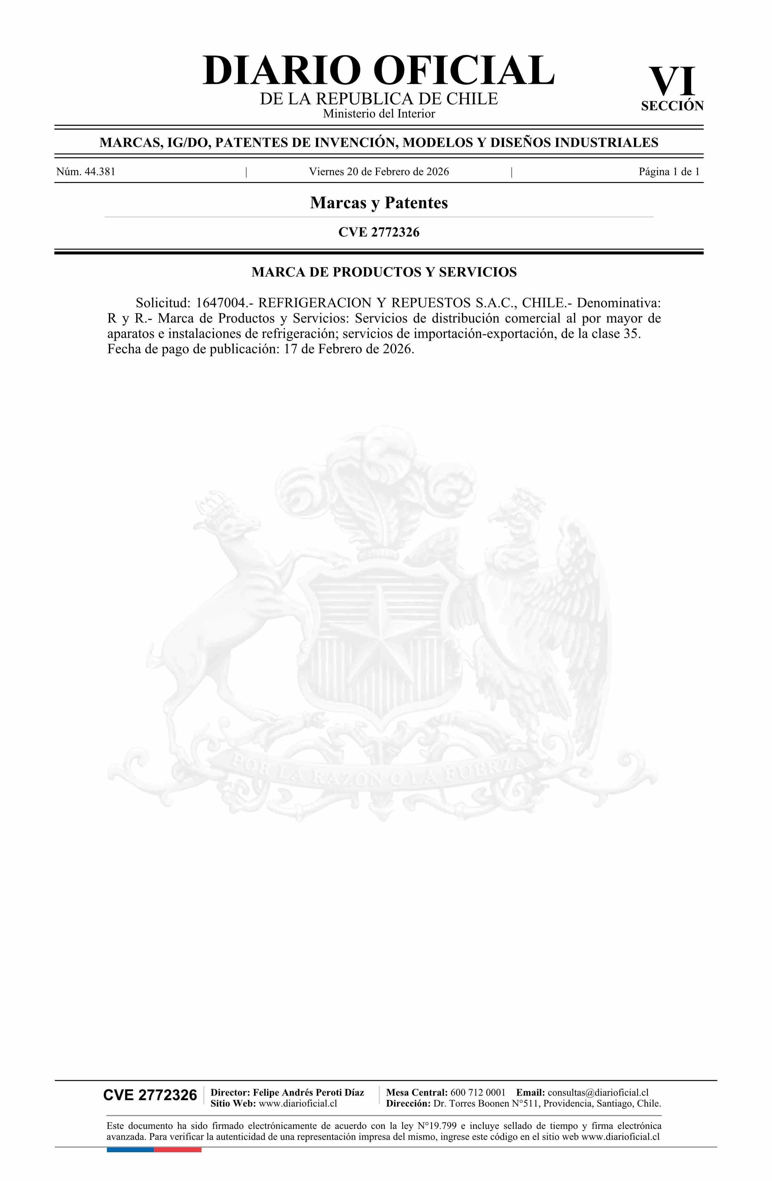 Diario Oficial Edición Electrónica (Diario Oficial de Chile - 6 Marcas Y Patentes)