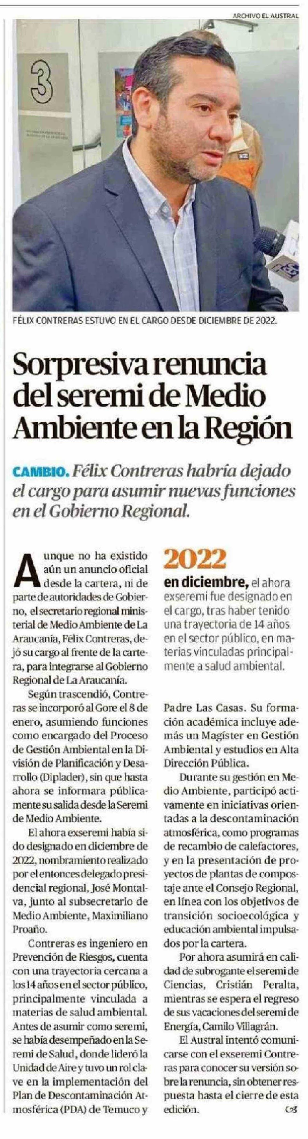 Sorpresiva renuncia del seremi de Medio Ambiente en la Región