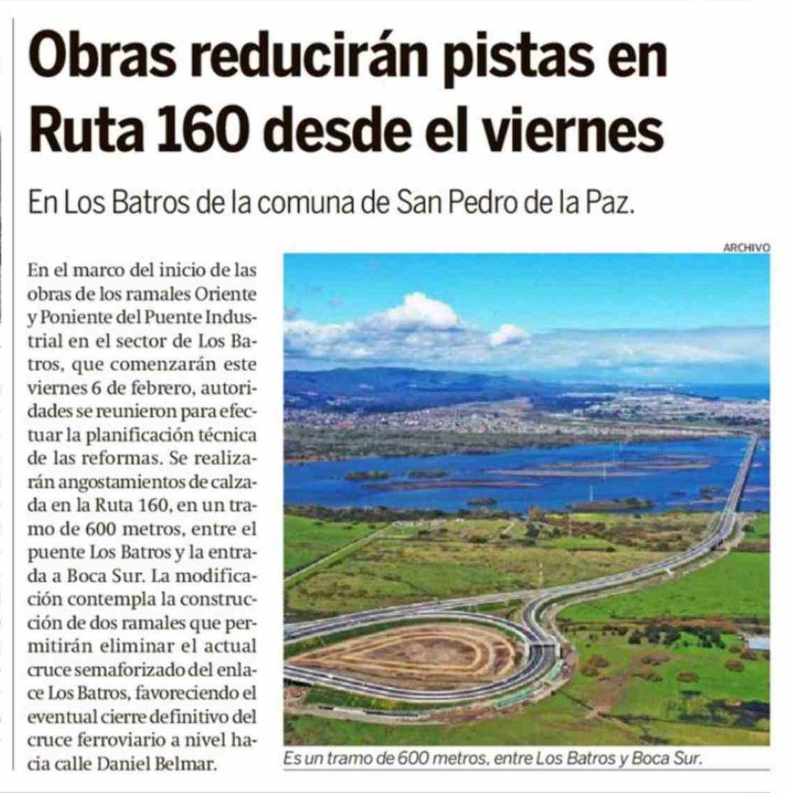 Obras reducirán pistas en Ruta 160 desde el viernes