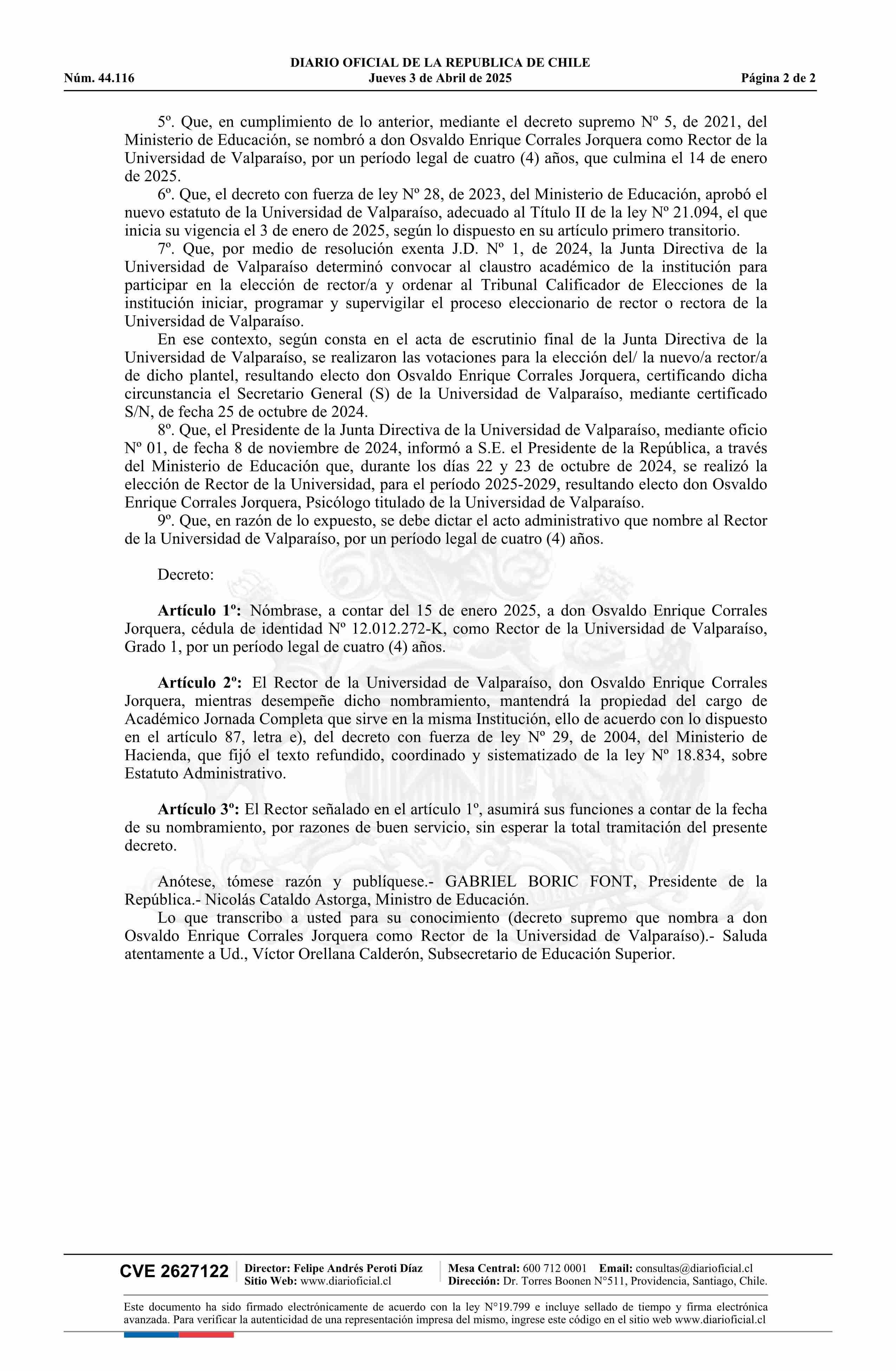 | Título: | Decreto número 167, de 2024.- Nombra a don Osvaldo Enrique Corrales Jorquera como rector de la Universidad de Valparaíso |