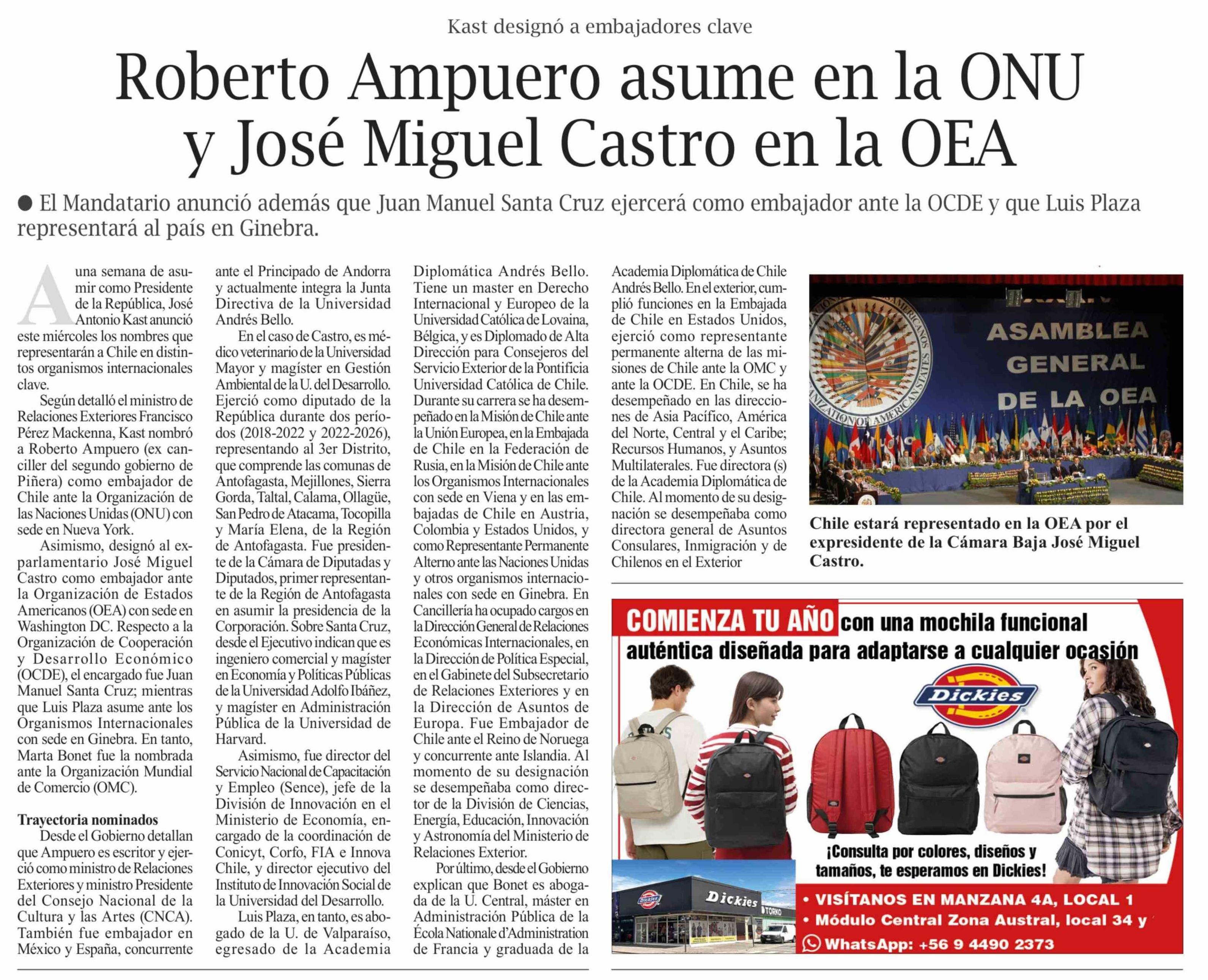 Título: Roberto Ampuero asume en la ONU y José Miguel Castro en la OEA