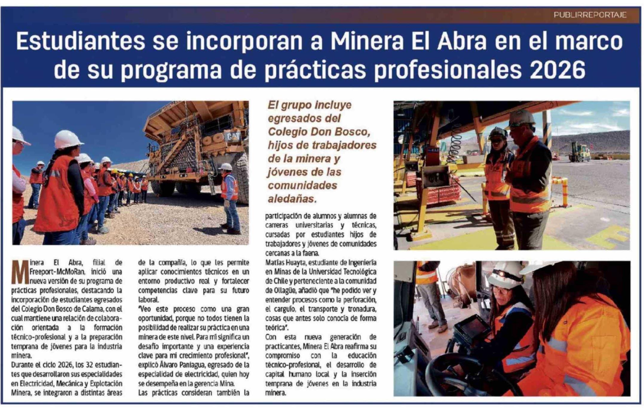 Estudiantes se incorporan a Minera El Abra en el marco de su programa de prácticas profesionales 2026