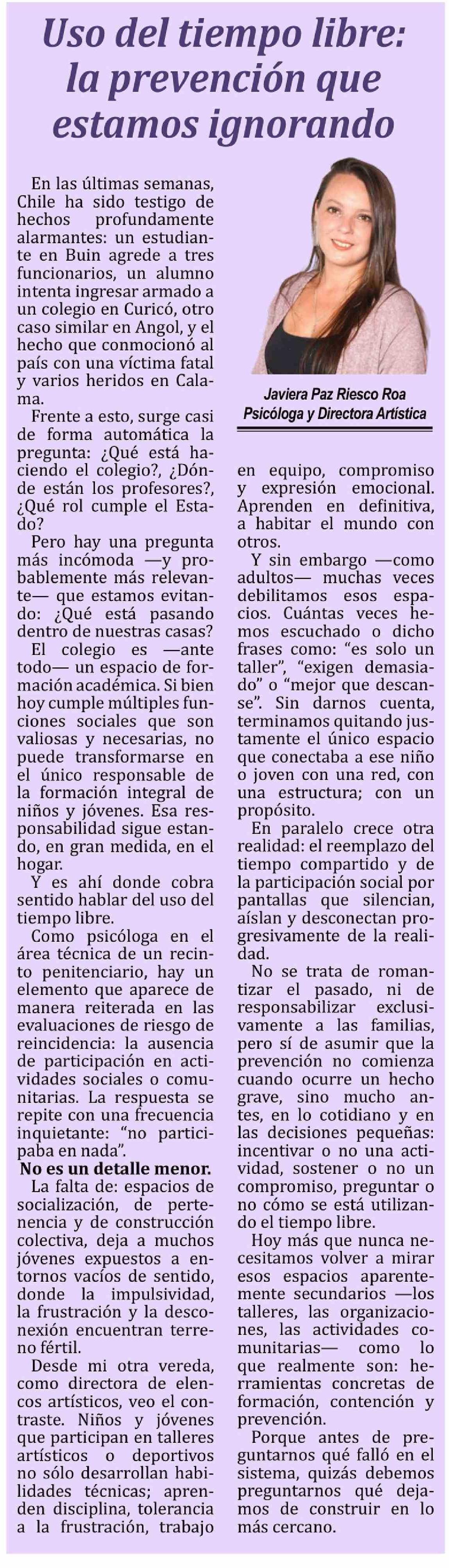 Columnas de Opinión: Uso del tiempo libre: la prevención que estamos ignorando