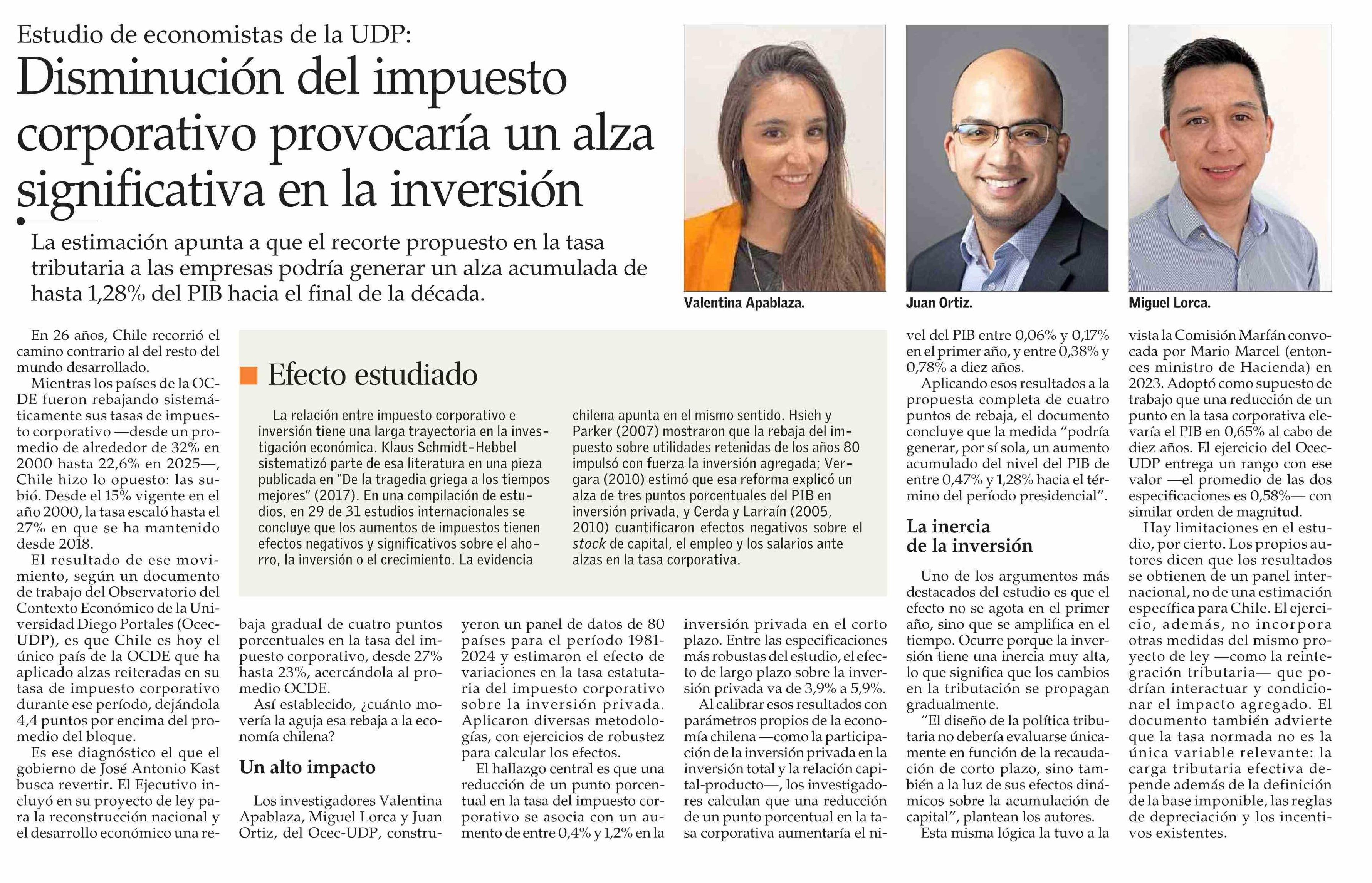 Disminución del impuesto corporativo provocaría un alza significativa en la inversión