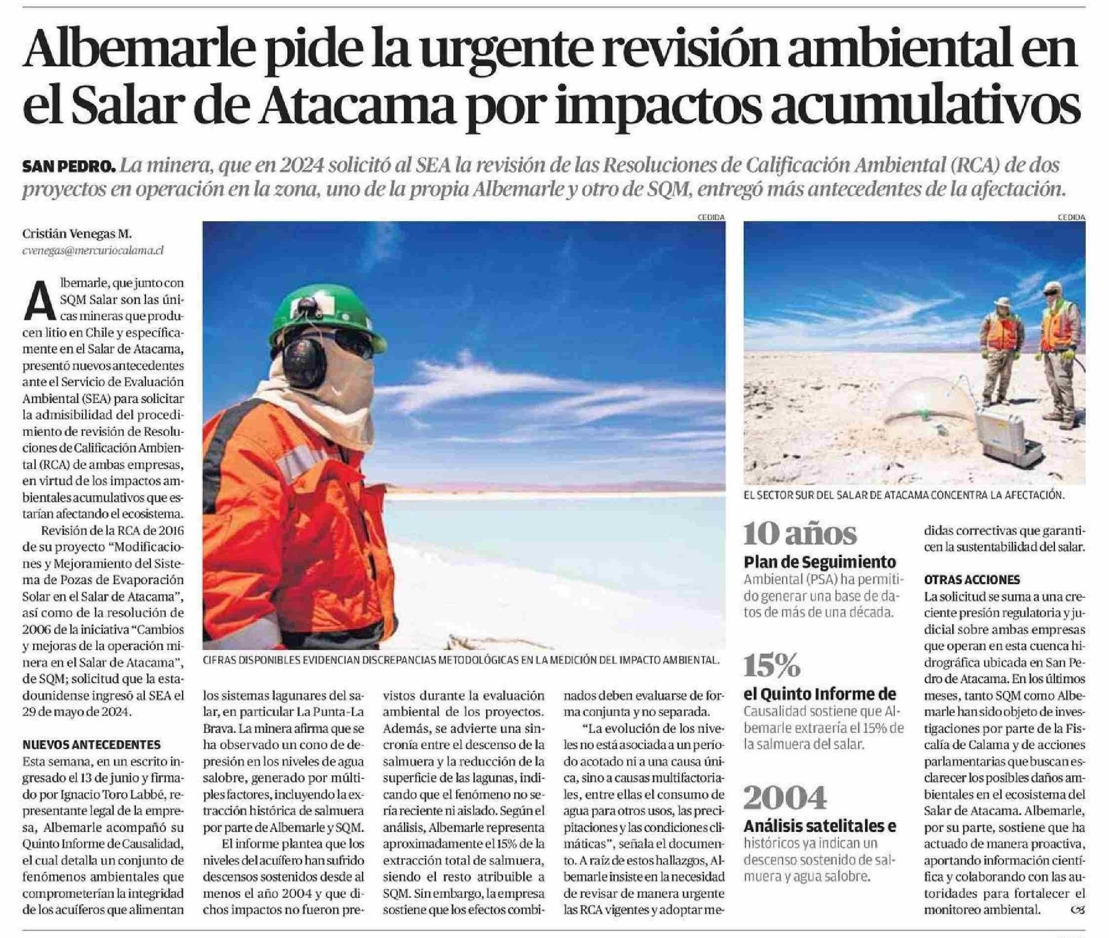 Albemarle pide la urgente revisión ambiental en el Salar de Atacama por impactos acumulativos