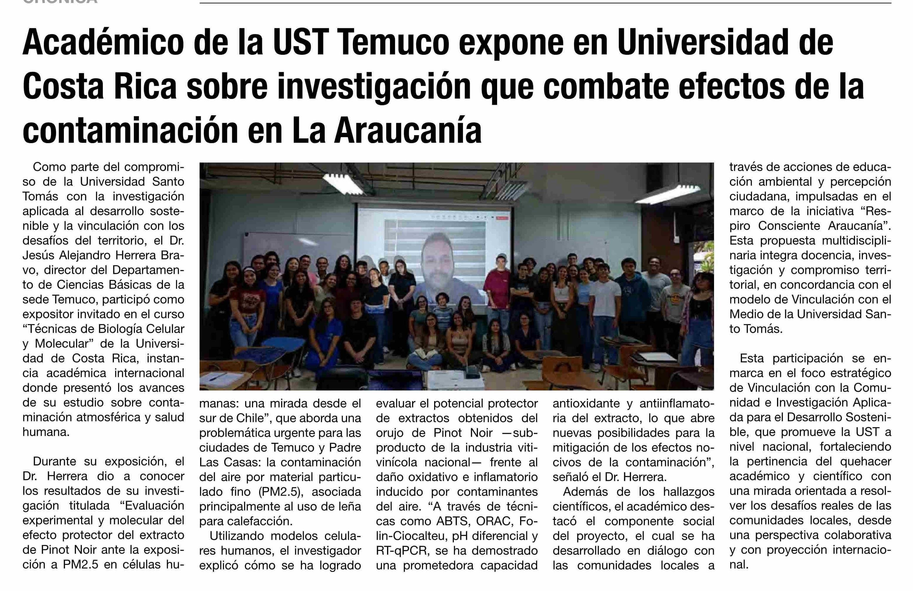 Académico de la UST Temuco expone en Universidad de Costa Rica sobre investigación que combate efectos de la contaminación en La Araucanía