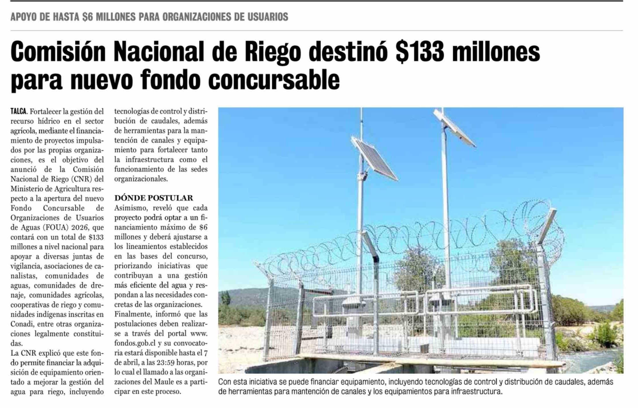 Comisión Nacional de Riego destino $133 millones para nuevo fondo concursable