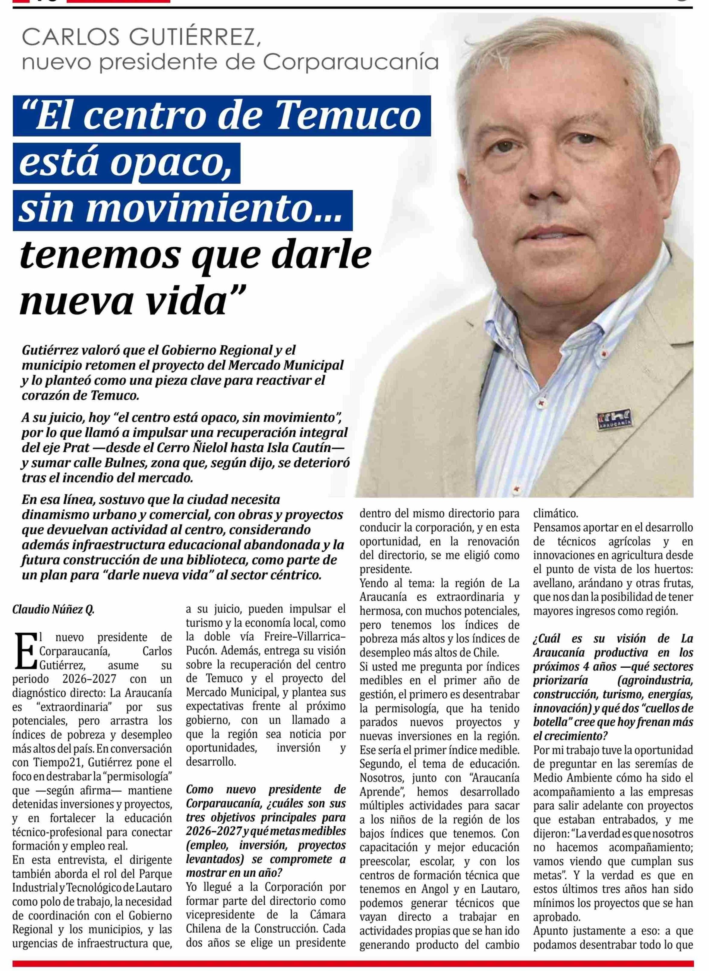 Título: Gutiérrez, asume periodo 2026-2027 un con diagnóstico directo: La Araucanía “extraordinaria" por sus es potenciales, pero arrastra los índices de pobreza y desempleo más altos del país. En conversación con Tiempo21, Gutiérrez pone el foco en destrabar la "permisología" que -según afirma- mantiene de