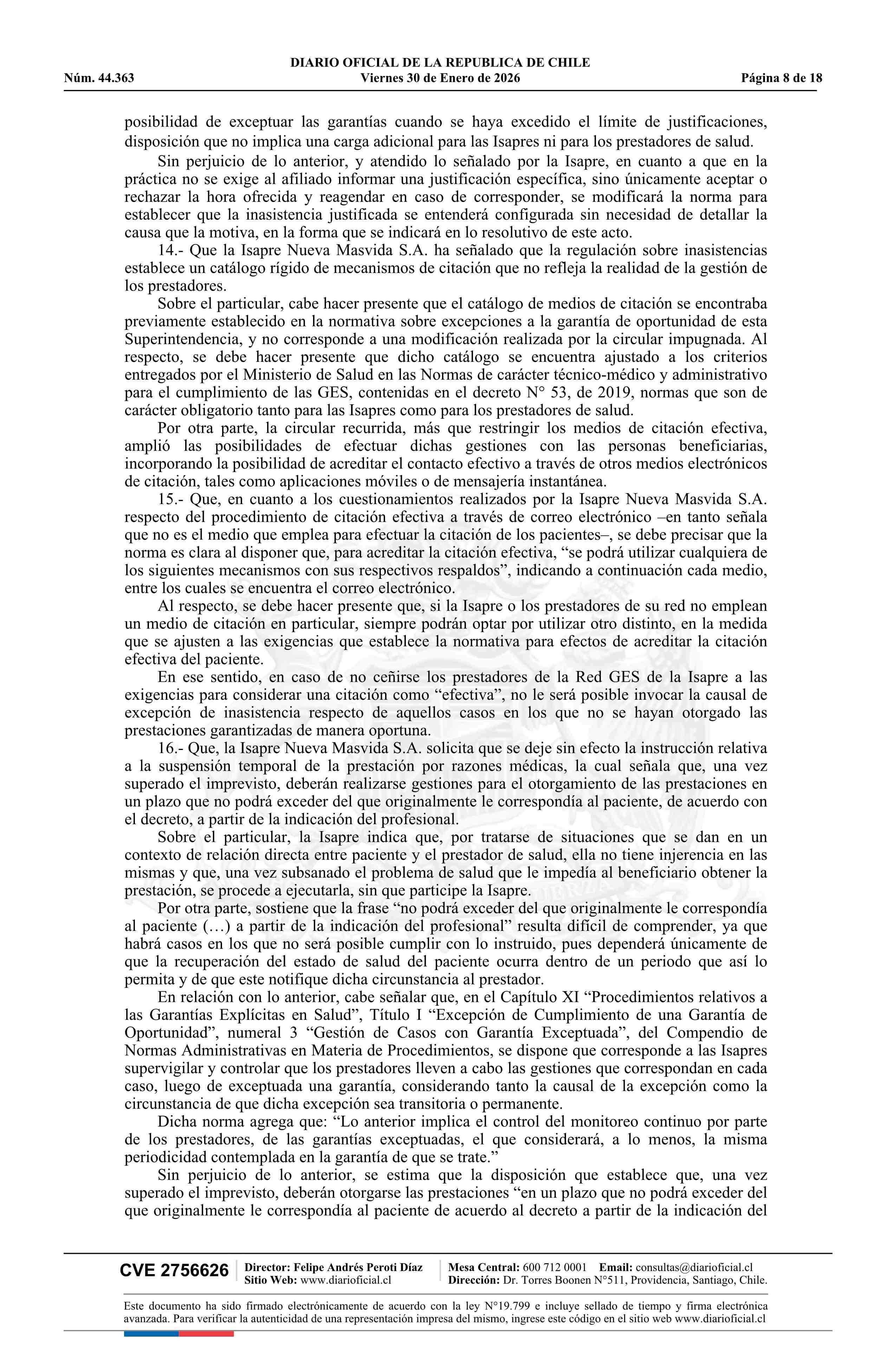 | Título: | Resolución exenta número IF 444, de 2026.- Acoge parcialmente los recursos de reposición deducidos por las isapres Colmena Golden Cross S.A., Nueva Masvida S.A., Cruz Blanca S.A. y Consalud S.A., y por la Subsecretaría de Redes Asistenciales, en contra de la circular IF/N° 501 de 2025 |