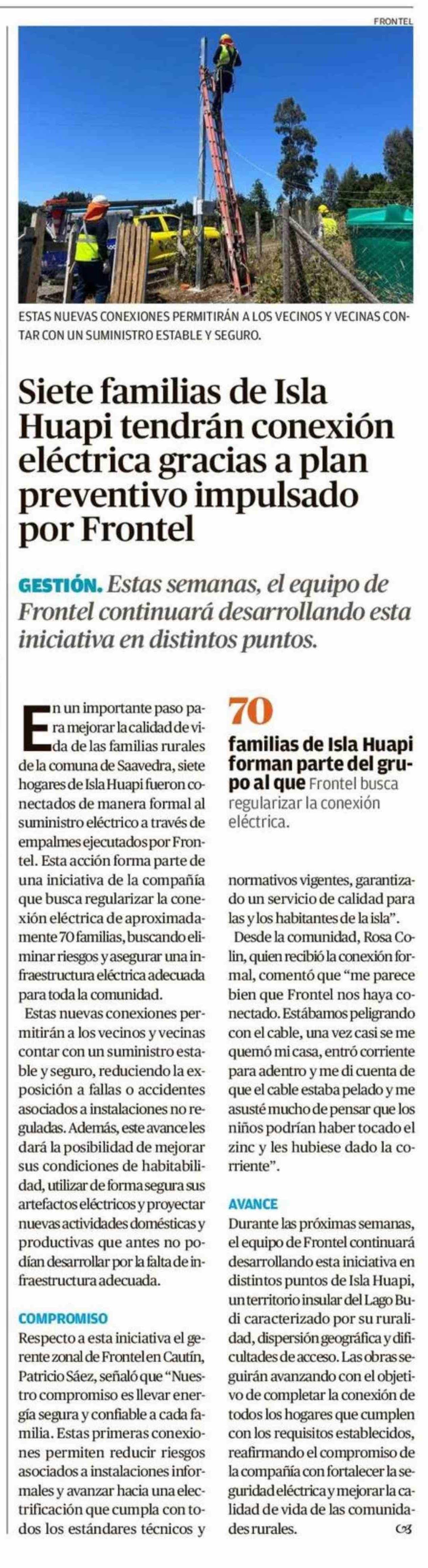 Siete familias de Isla Huapi tendrán conexión eléctrica gracias a plan preventivo impulsado por Frontel