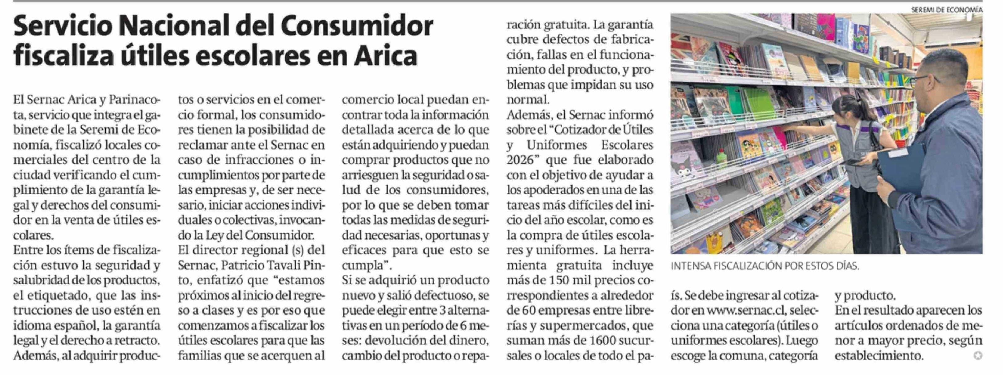 Servicio Nacional del Consumidor fiscaliza útiles escolares en Arica