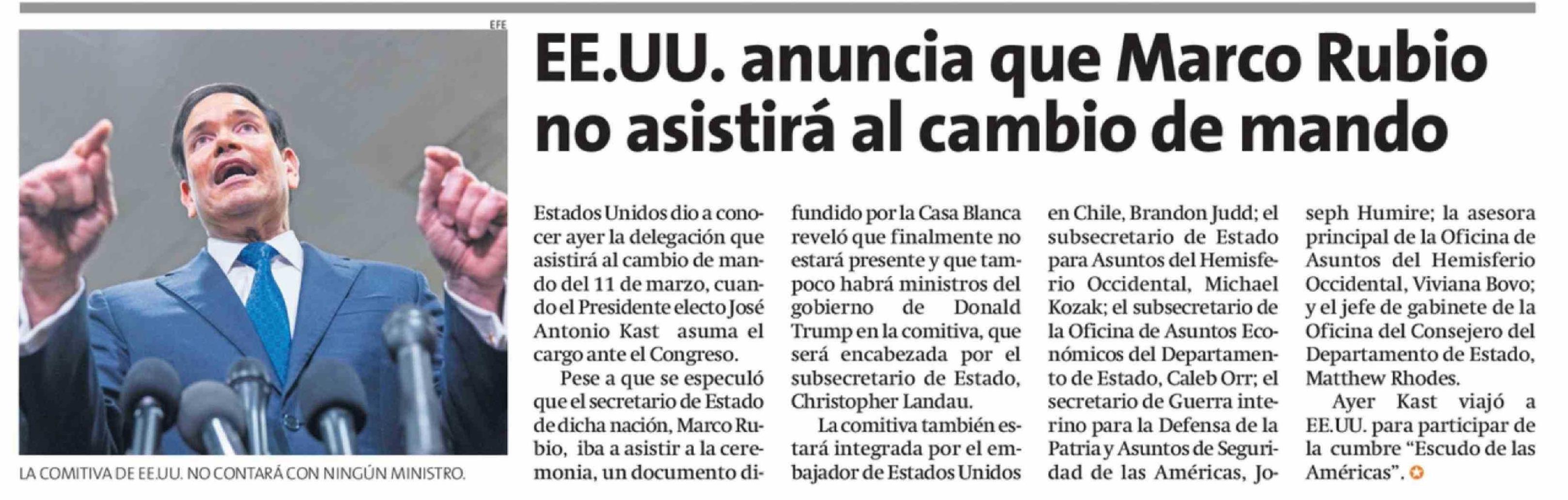 EE.UU. anuncia que Marco Rubio no asistirá al cambio de mando