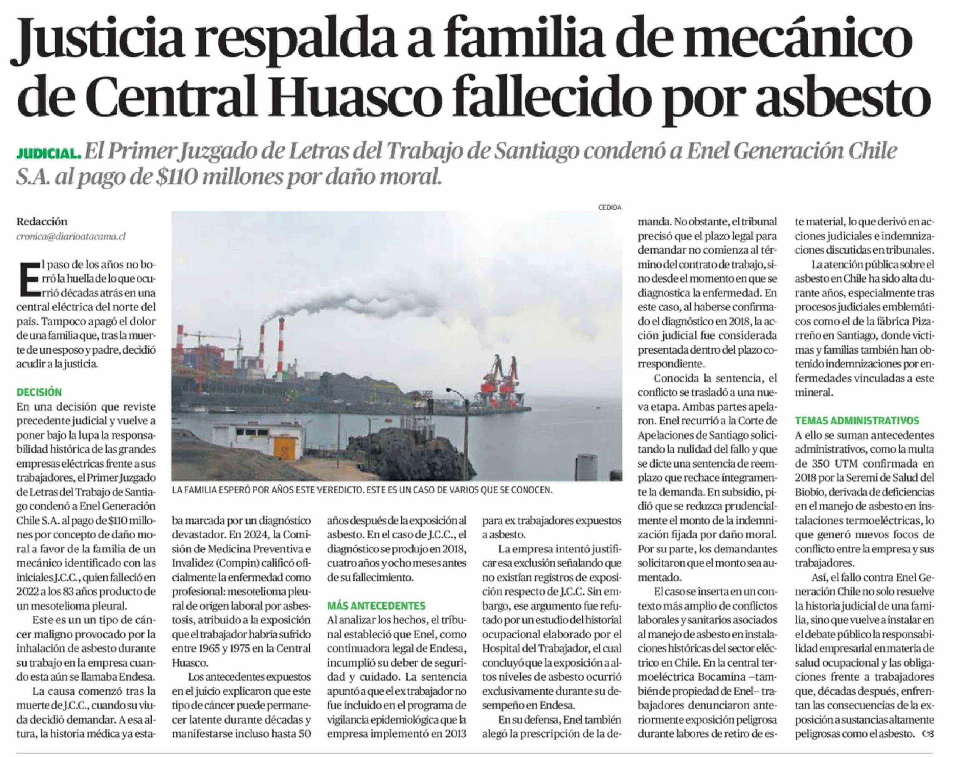 Justicia respalda a familia de mecánico de Central Huasco fallecido por asbesto