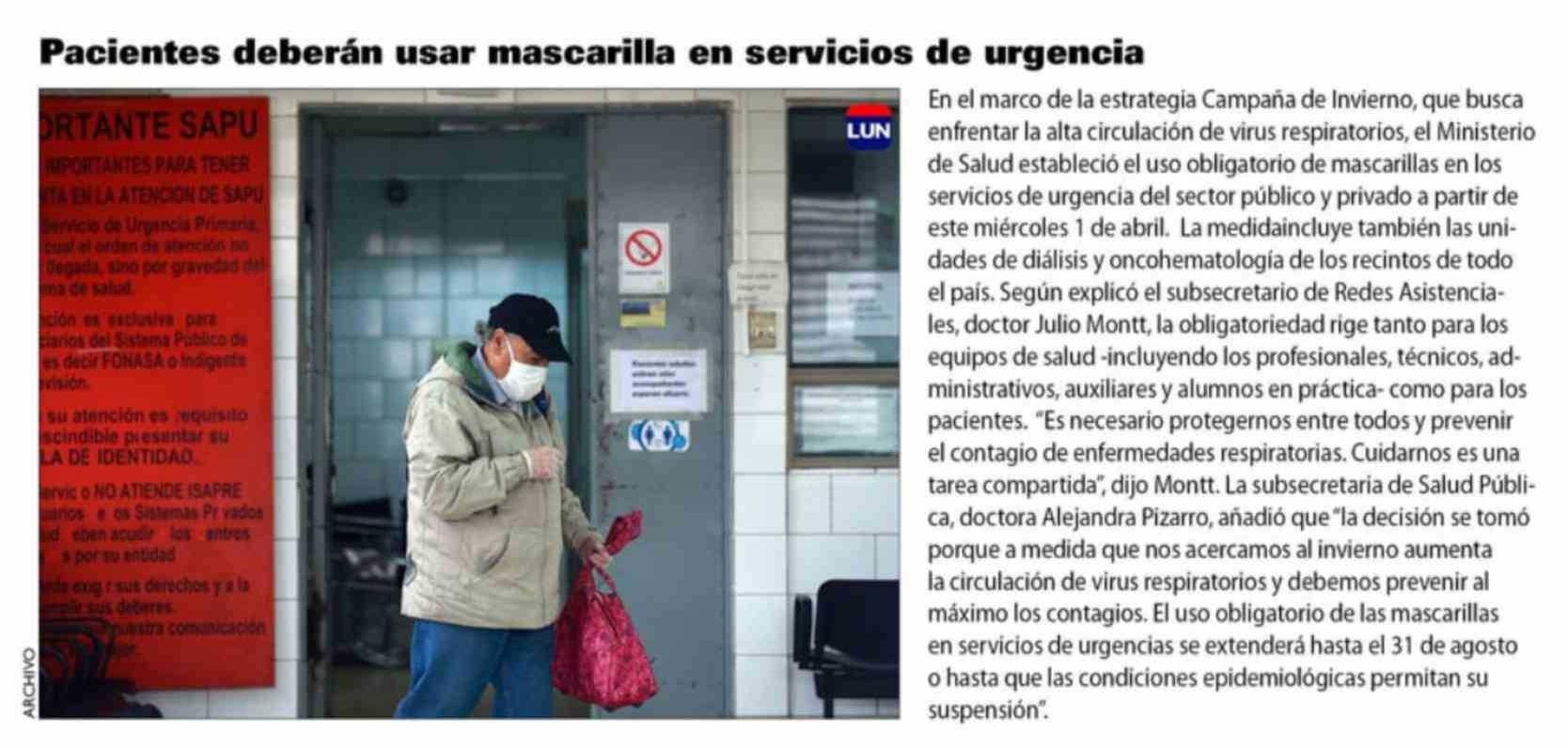 Pacientes deberán usar mascarilla en servicios de urgencia