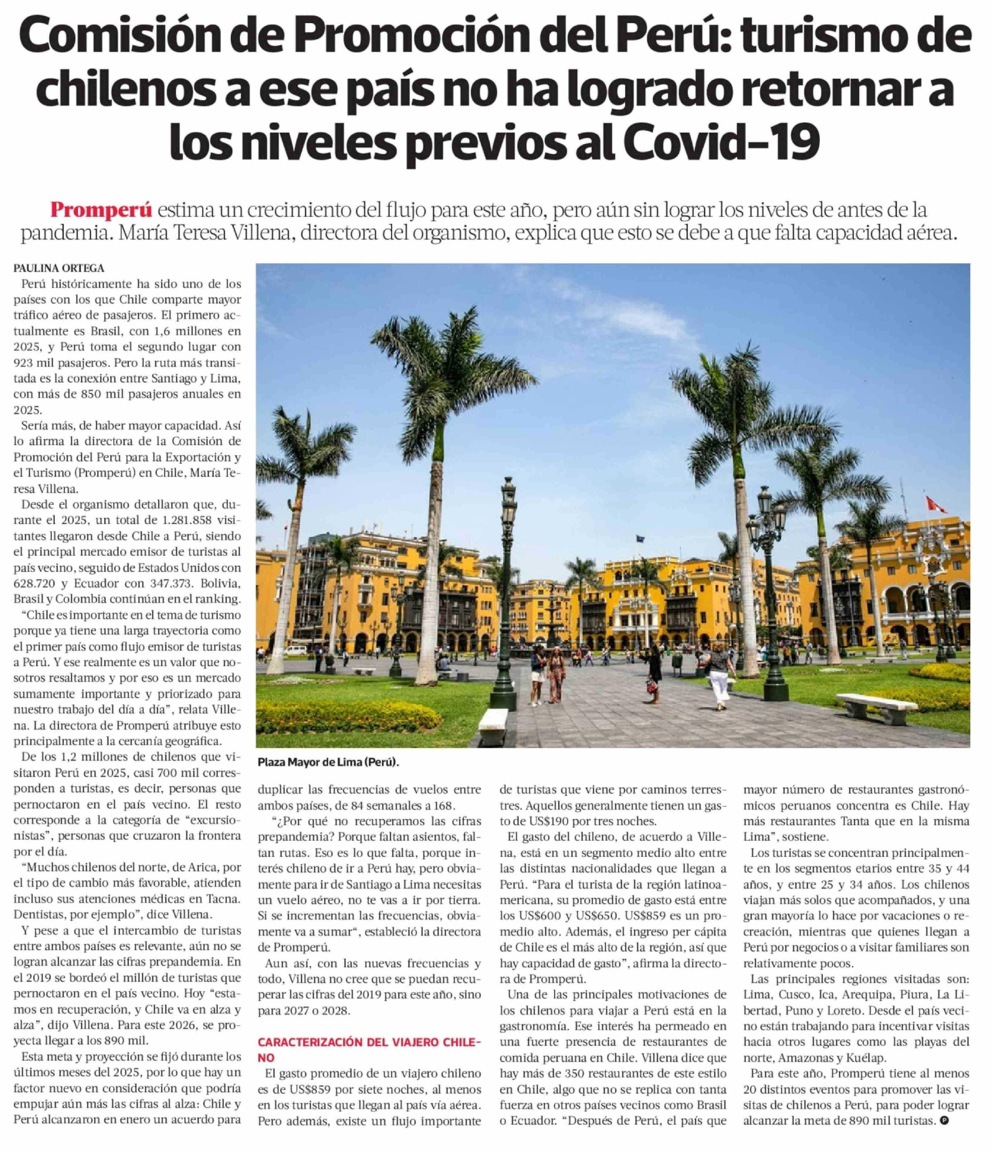 Comisión de Promoción del Perú: turismo de chilenos a ese país no ha logrado retornar a los niveles previos al Covid-19