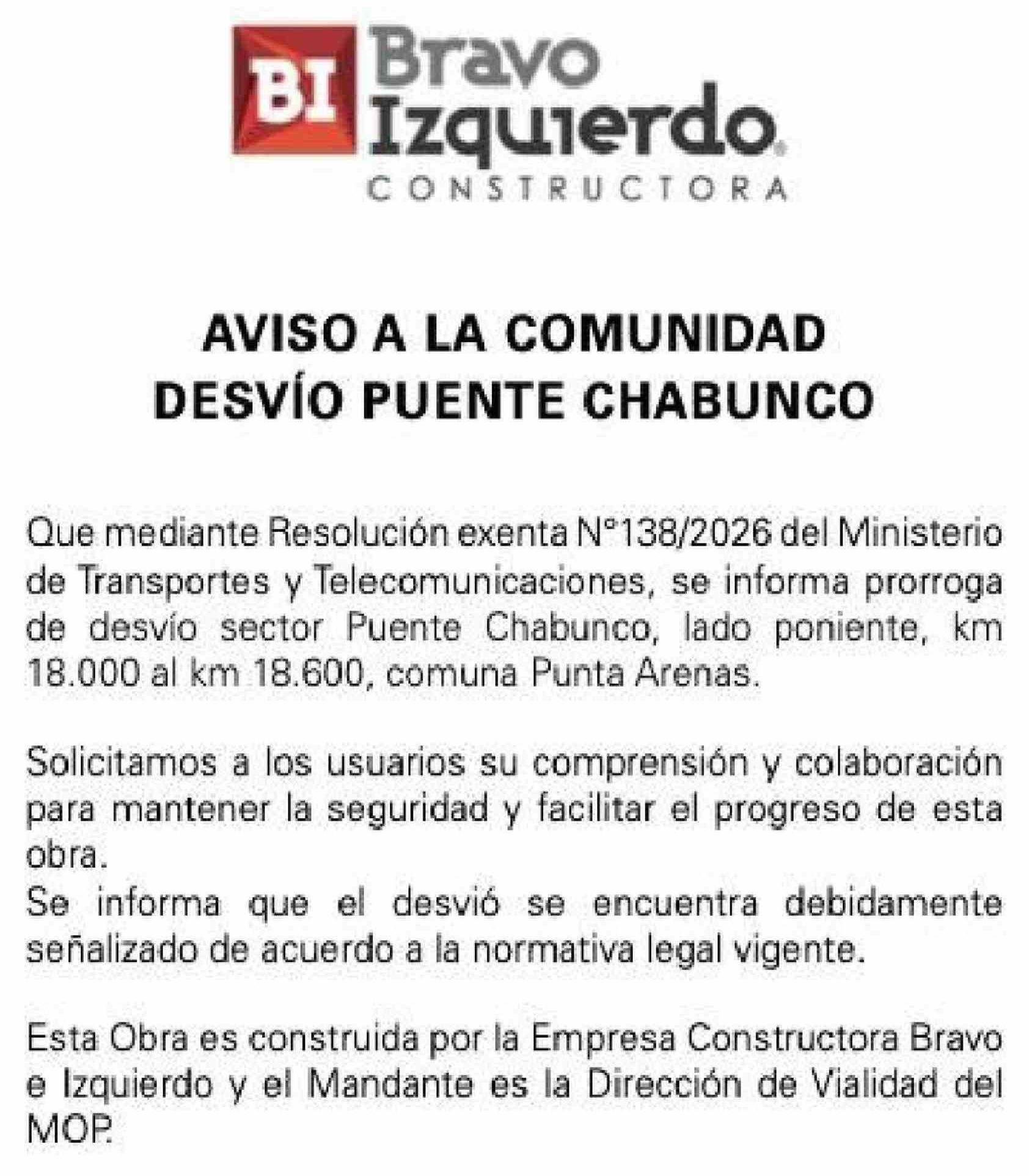 AVISO A LA COMUNIDAD DESVÍO PUENTE CHABUNCO