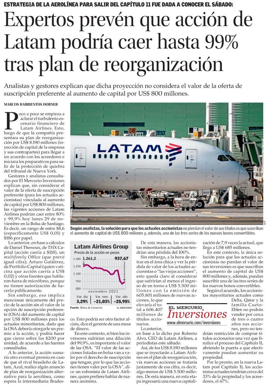 Expertos prevén que acción de Latam podría caer hasta 99% tras plan de reorganización