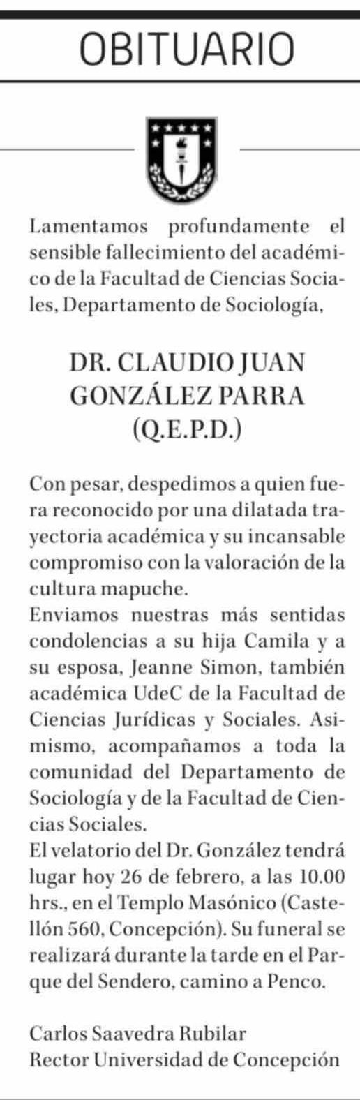Título: Obituario: OBITUARIO Lamentamos profundamente el sensible fallecimiento del académico de la Facultad de Ciencias Sociales, Departamento de Sociología, DR. CLAUDIO JUAN GONZÁLEZ PARRA (Q.E.P.D.)