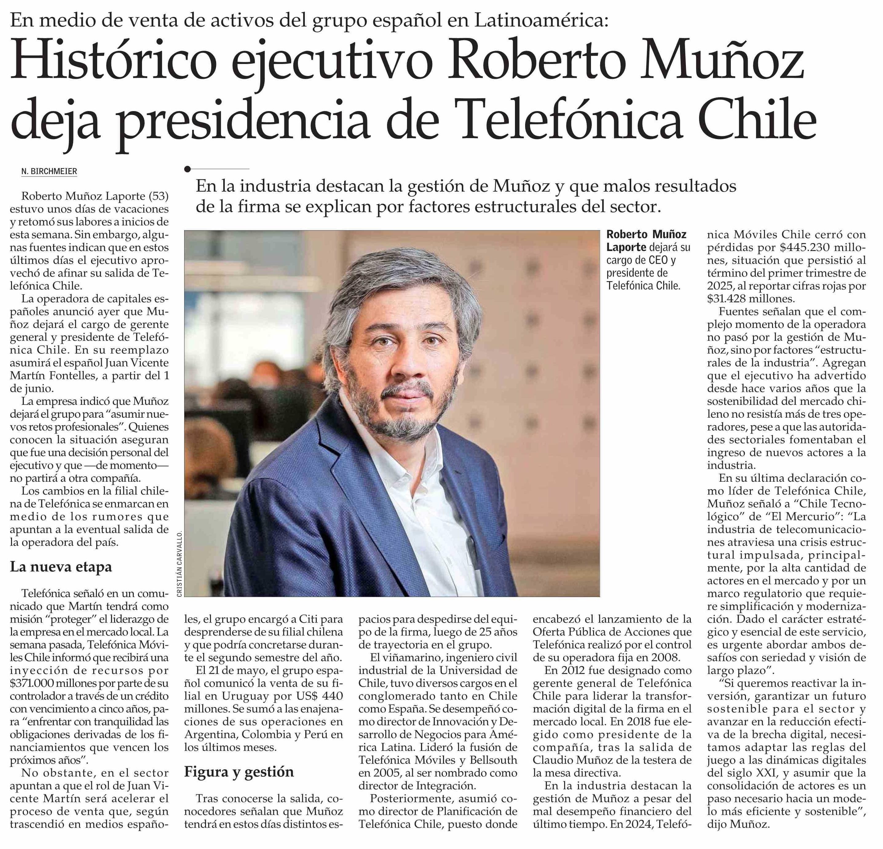 Histórico ejecutivo Roberto Muñoz deja presidencia de Telefónica Chile