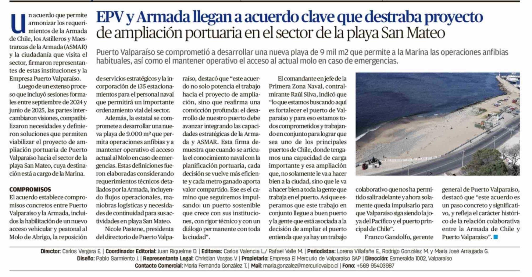 | Título: | EPV y Armada llegan a acuerdo clave que destraba proyecto de ampliación portuaria en el sector de la playa San Mateo |