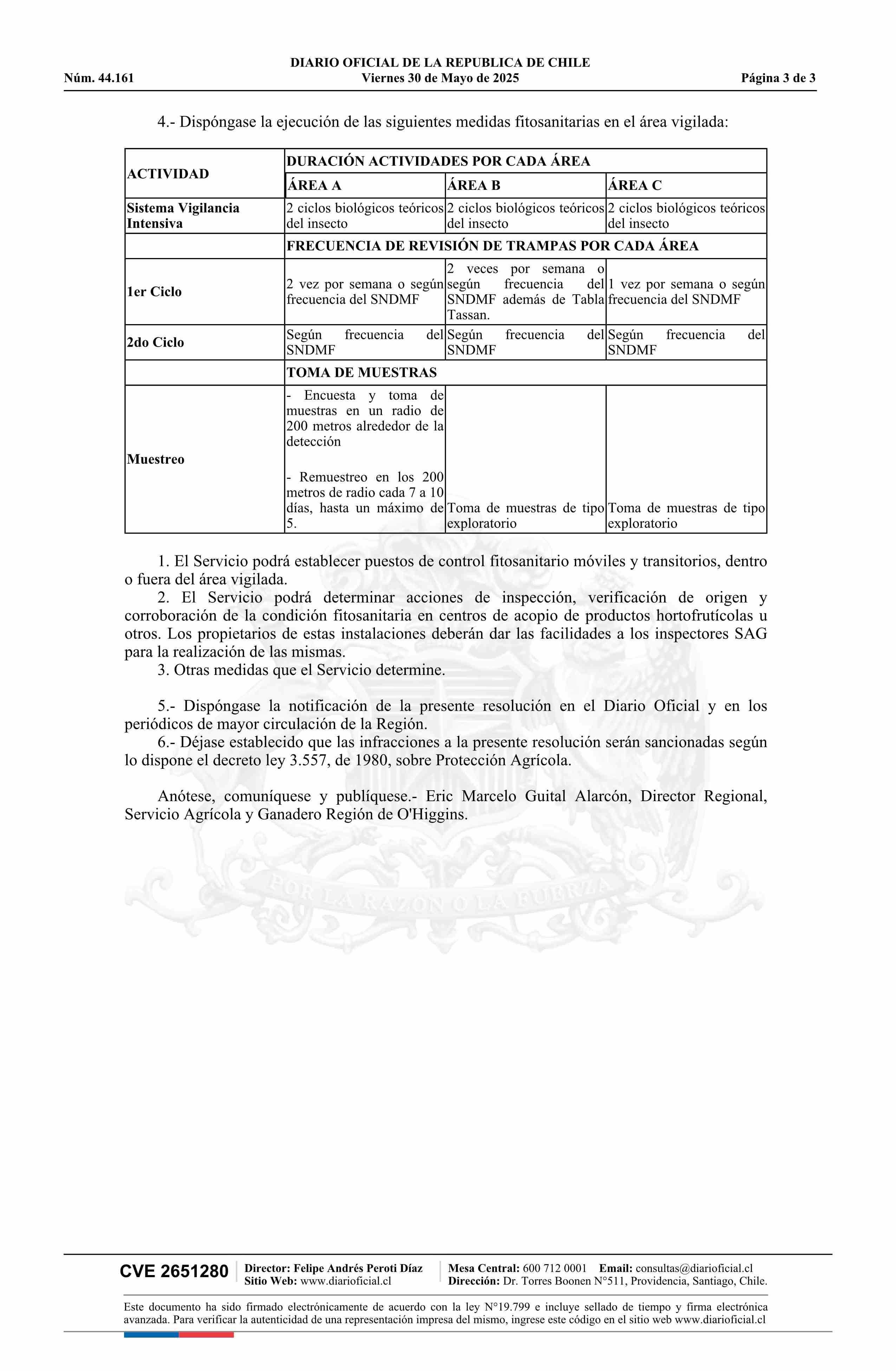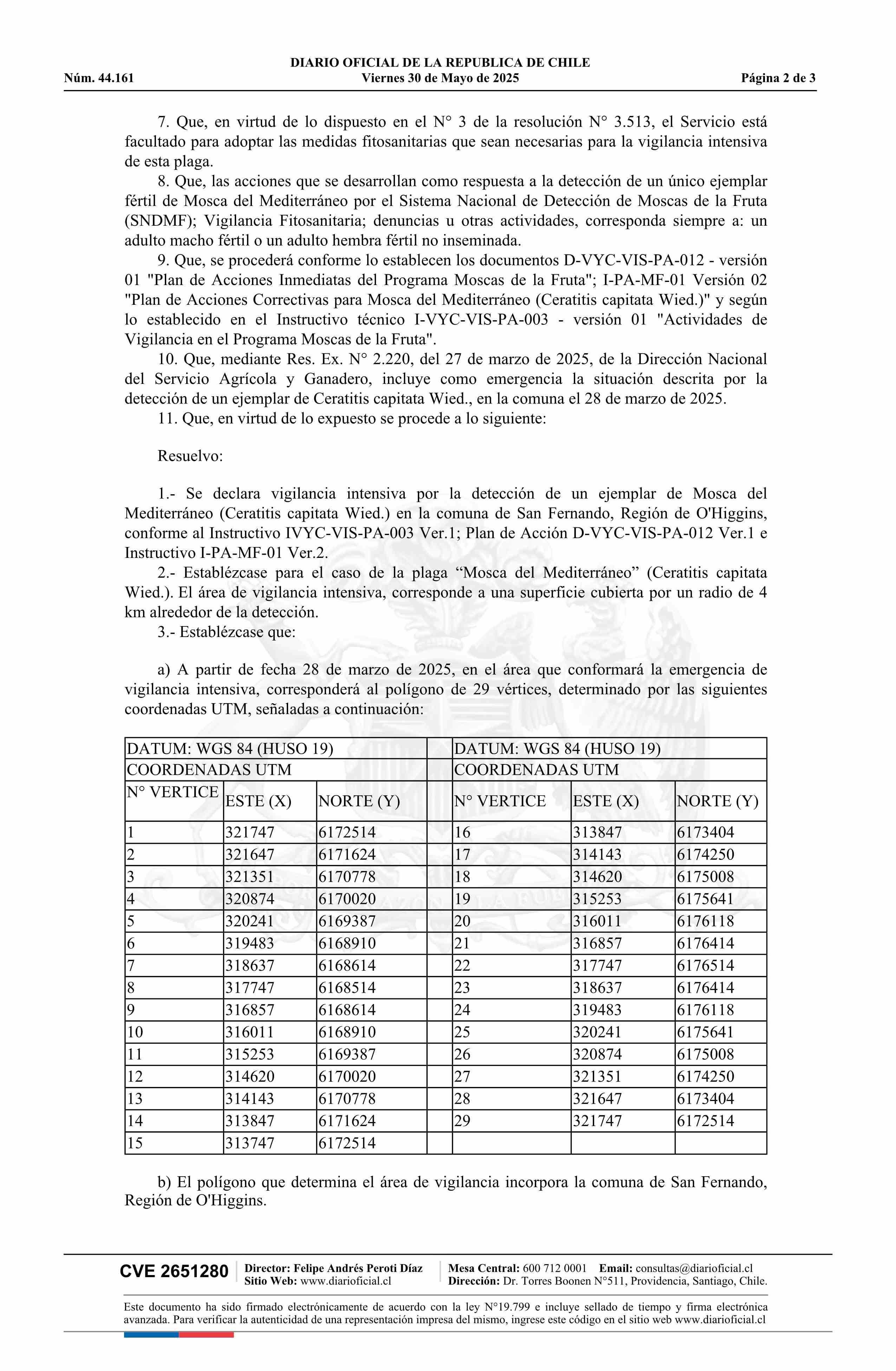 | Título: | Resolución exenta número 975, de 2025.- Activa vigilancia intensiva ante la detección de un único ejemplar adulto de Mosca del Mediterráneo (Ceratitis capitata Wied) en la comuna de San Fernando |