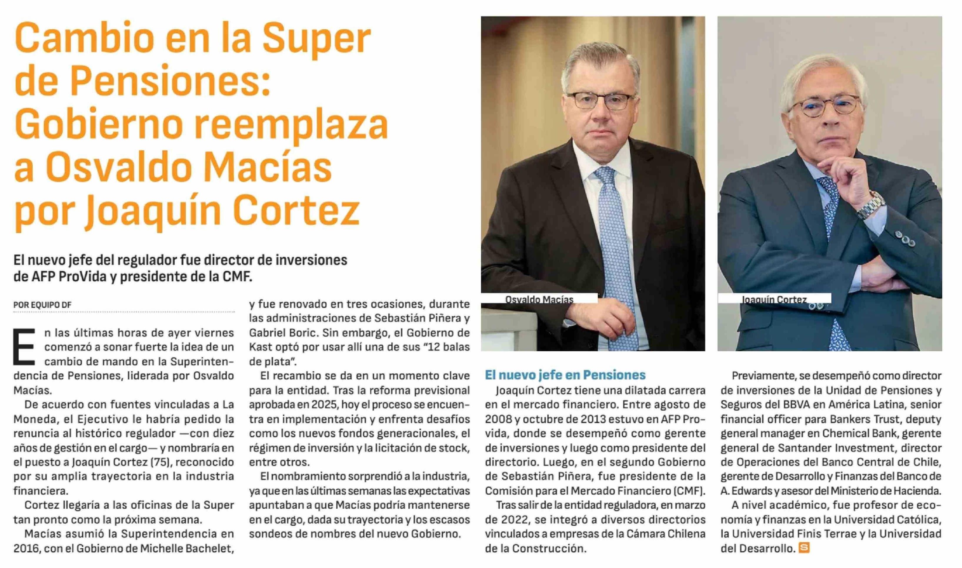 Título: Cambio en la Super de Pensiones: Gobierno reemplaza a Osvaldo Macías por Joaquín Cortez