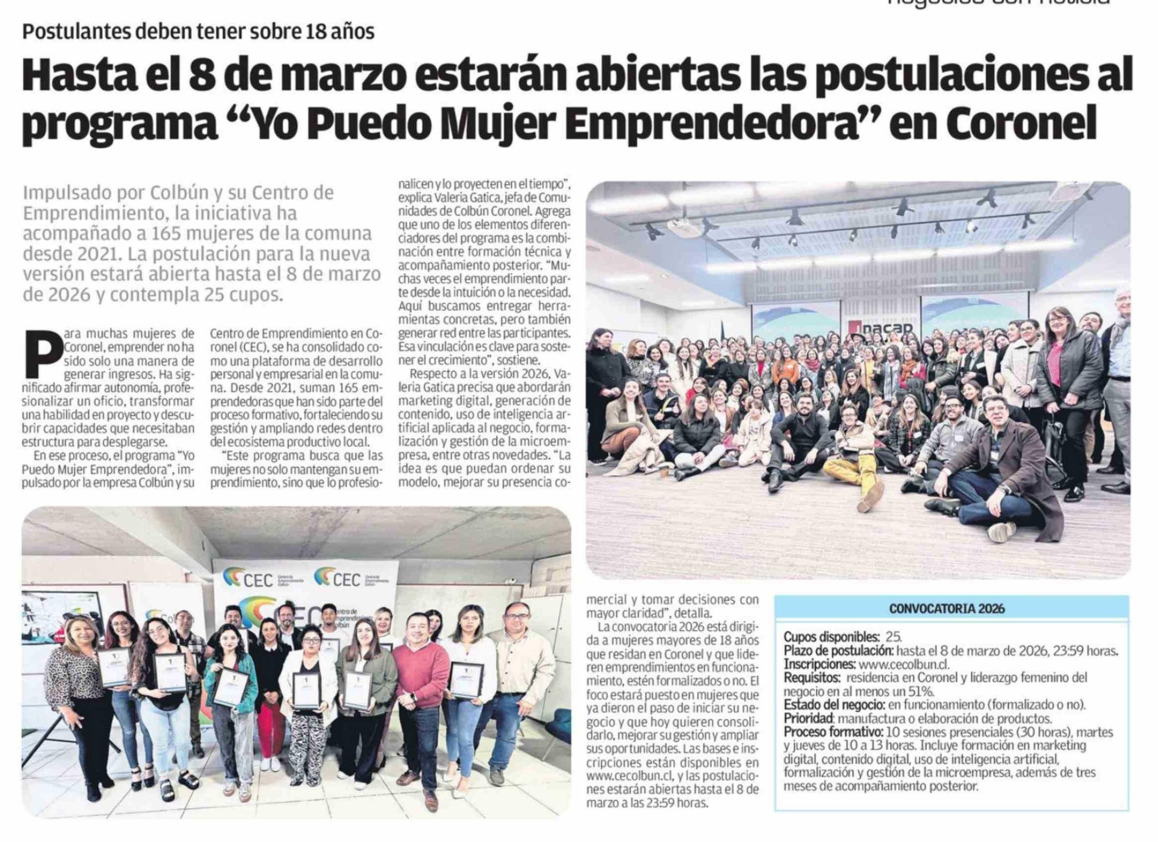 Hasta el 8 de marzo estarán abiertas las postulaciones al programa "Yo Puedo Mujer Emprendedora" en Coronel