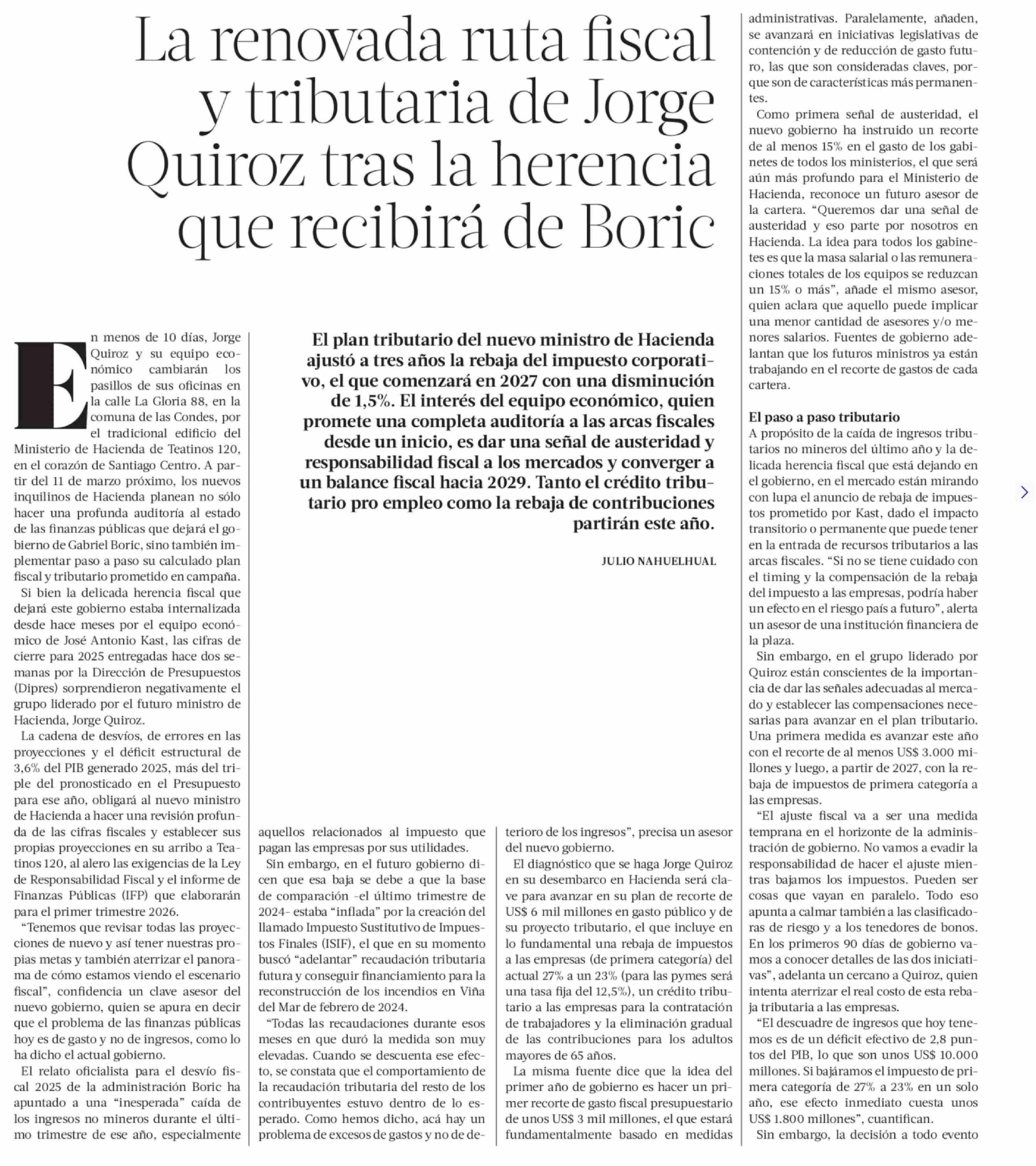 La renovada ruta fiscal y tributaria de Jorge Quiroz tras la herencia que recibirá de Boric