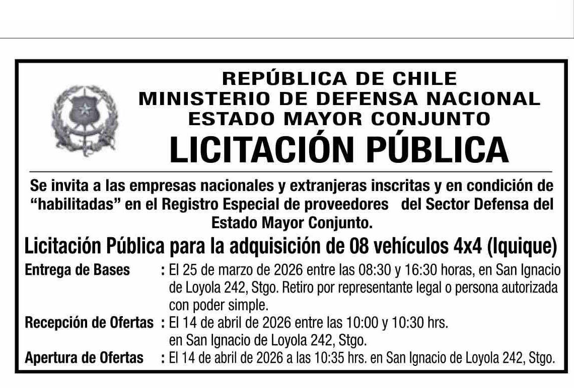 AVISO LICITACIONES: REPÚBLICA DE CHILE MINISTERIO DE DEFENSA NACIONAL ESTADO MAYOR CONJUNTO LICITACIÓN PÚBLICA