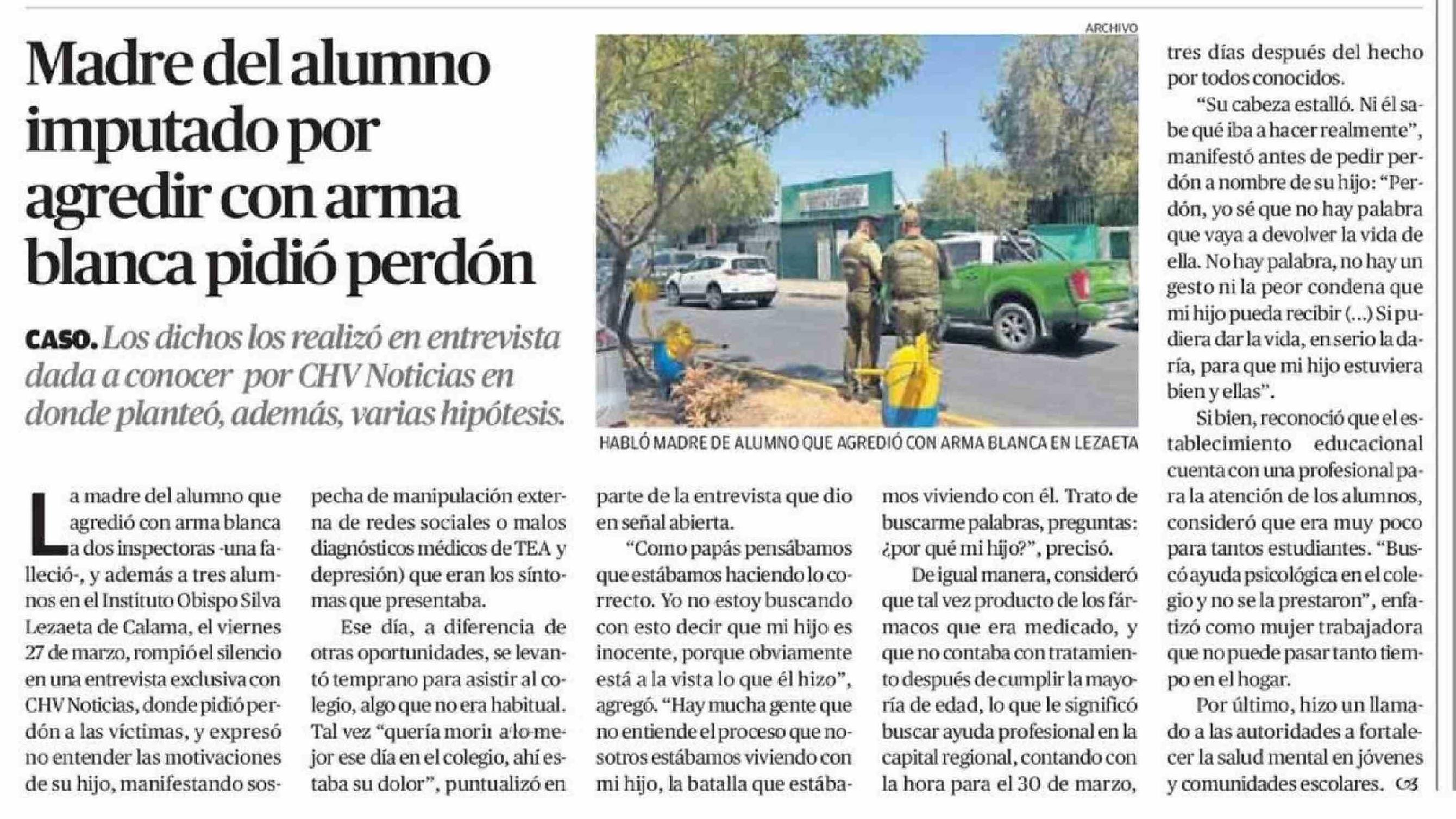 Madre del alumno imputado por agredir con arma blanca pidió perdón