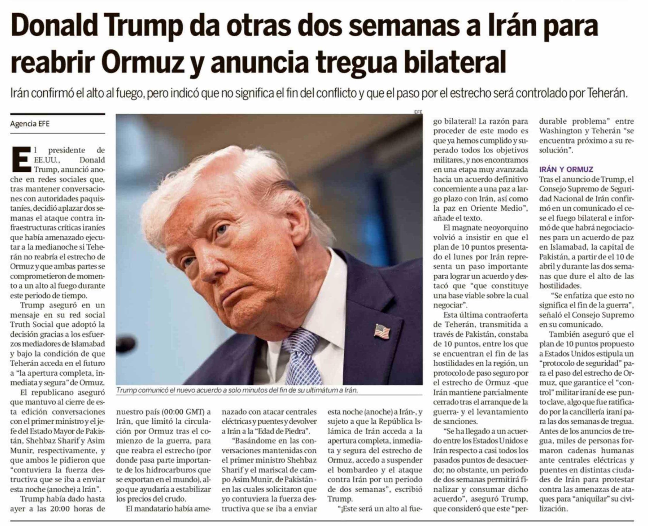 Donald Trump da otras dos semanas a Irán para reabrir Ormuz y anuncia tregua bilateral