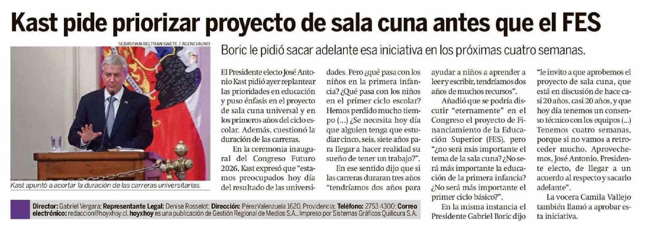 Kast pide priorizar proyecto de sala cuna antes que el FES