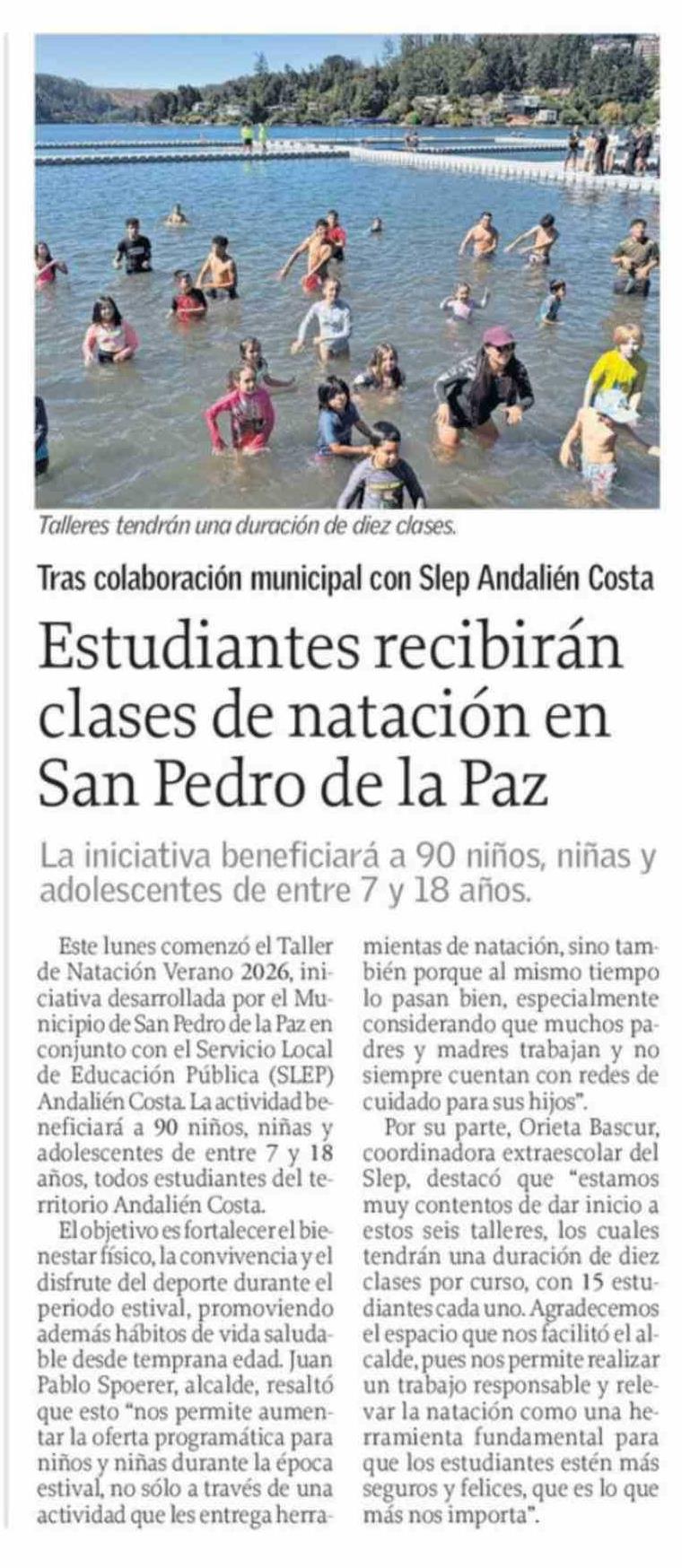Estudiantes recibirán clases de natación en San Pedro de la Paz