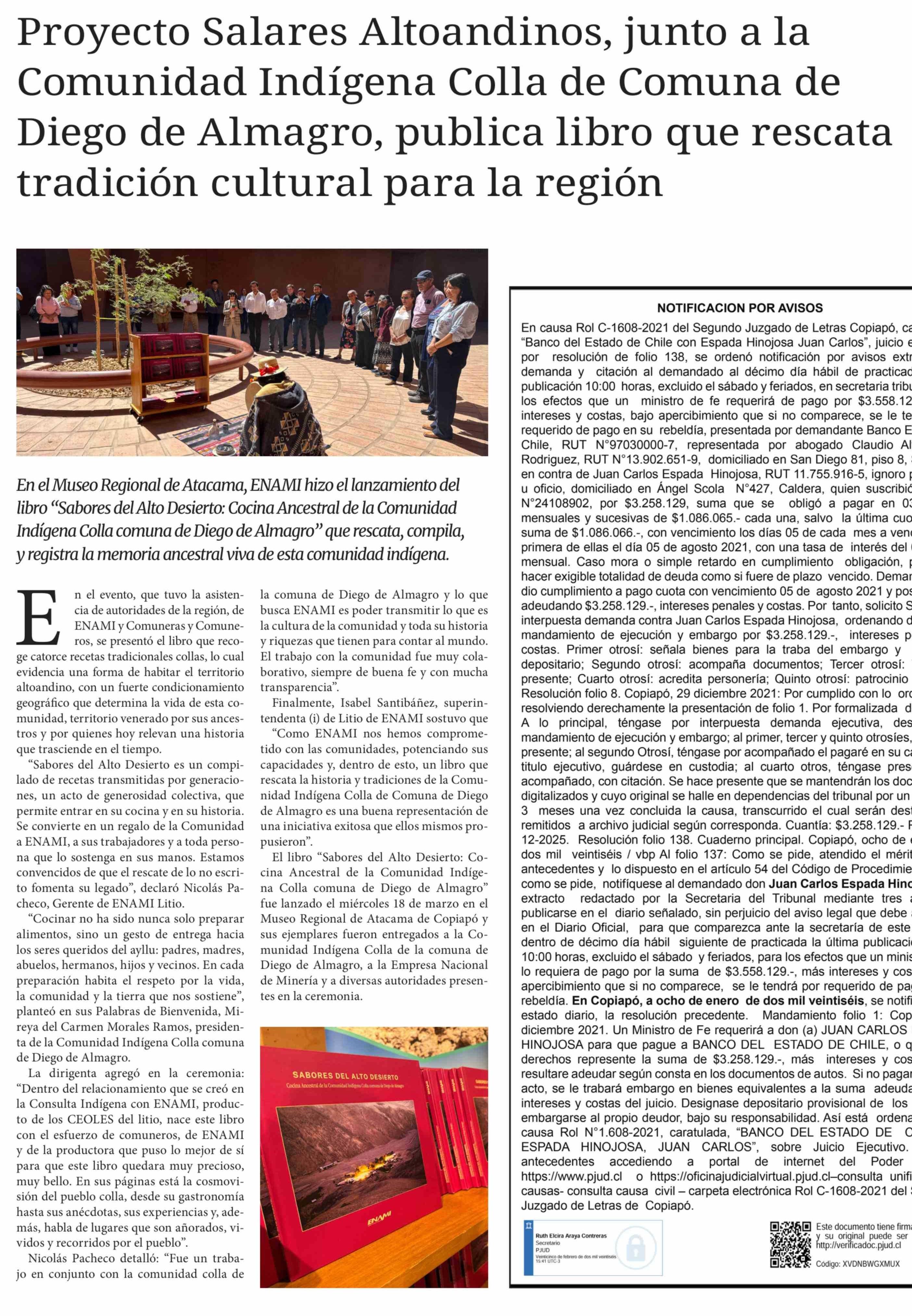 | Título: | Proyecto Salares Altoandinos, junto a la Comunidad Indígena Colla de Comuna de Diego de Almagro, publica libro que rescata tradición cultural para la región |