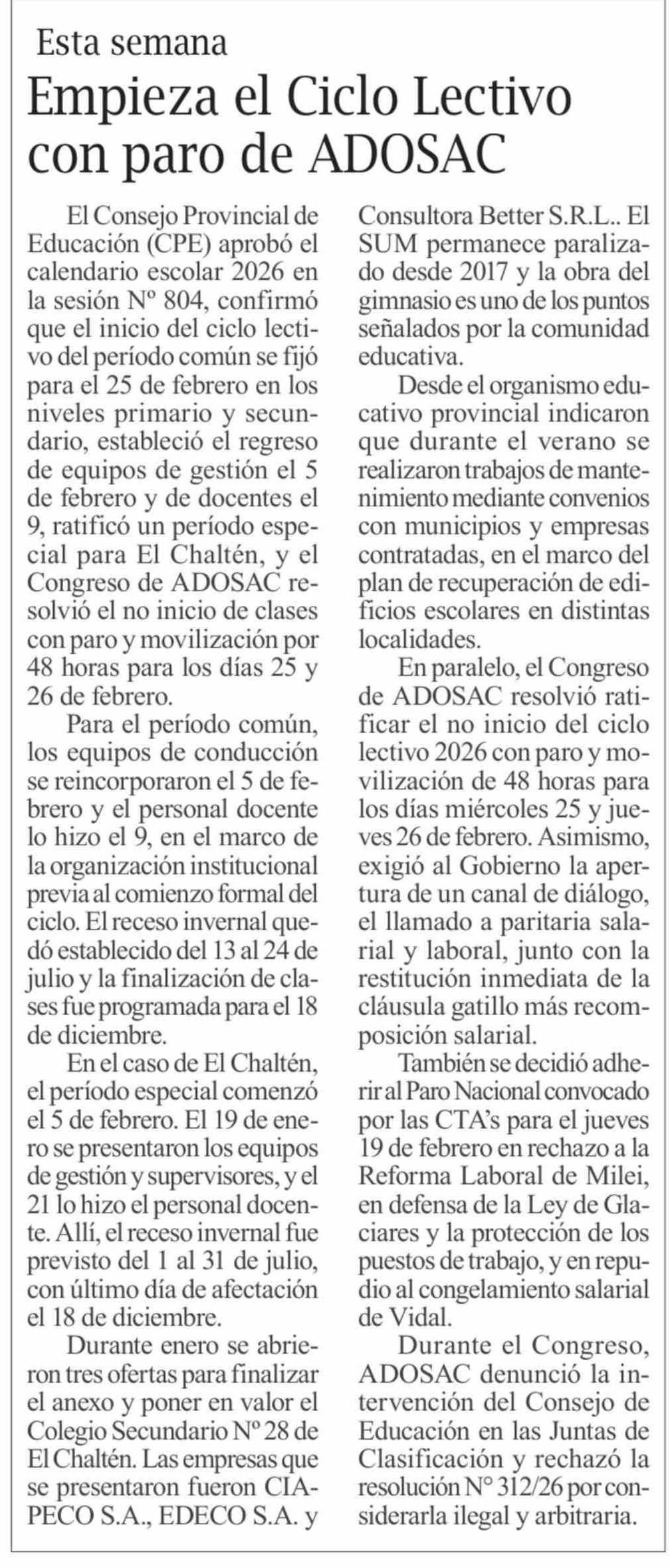 Empieza el Ciclo Lectivo con paro de ADOSAC