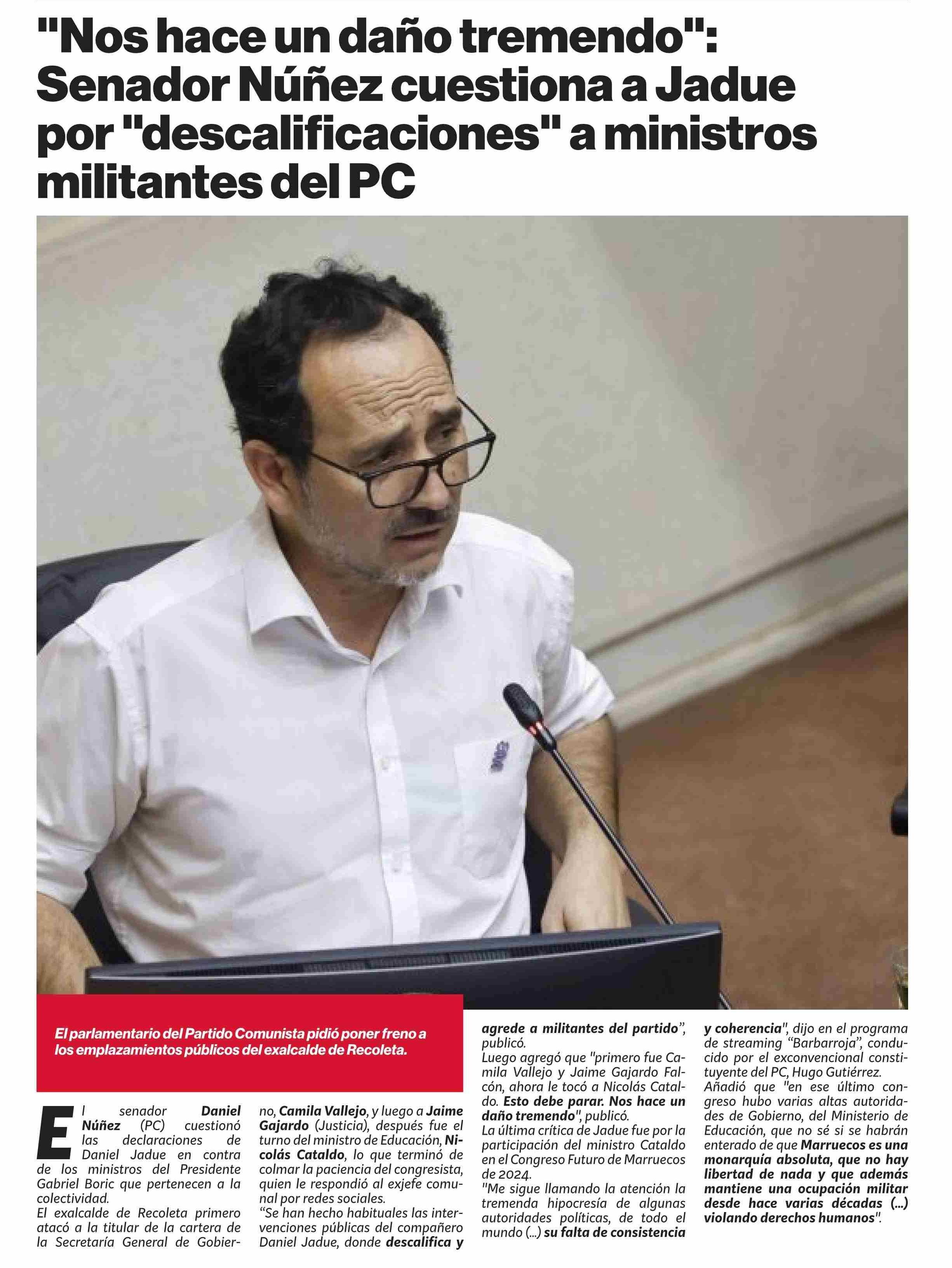 “Nos hace un daño tremendo”: Senador Nunez cuestiona a Jadue “descalificaciones” a ministros militantes del PC