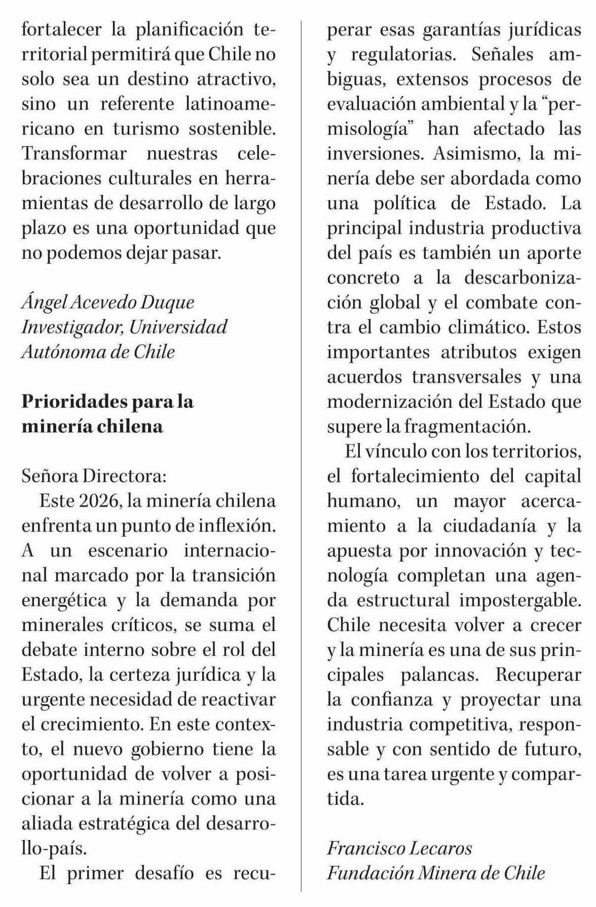 Cartas: Prioridades para la minería chilena