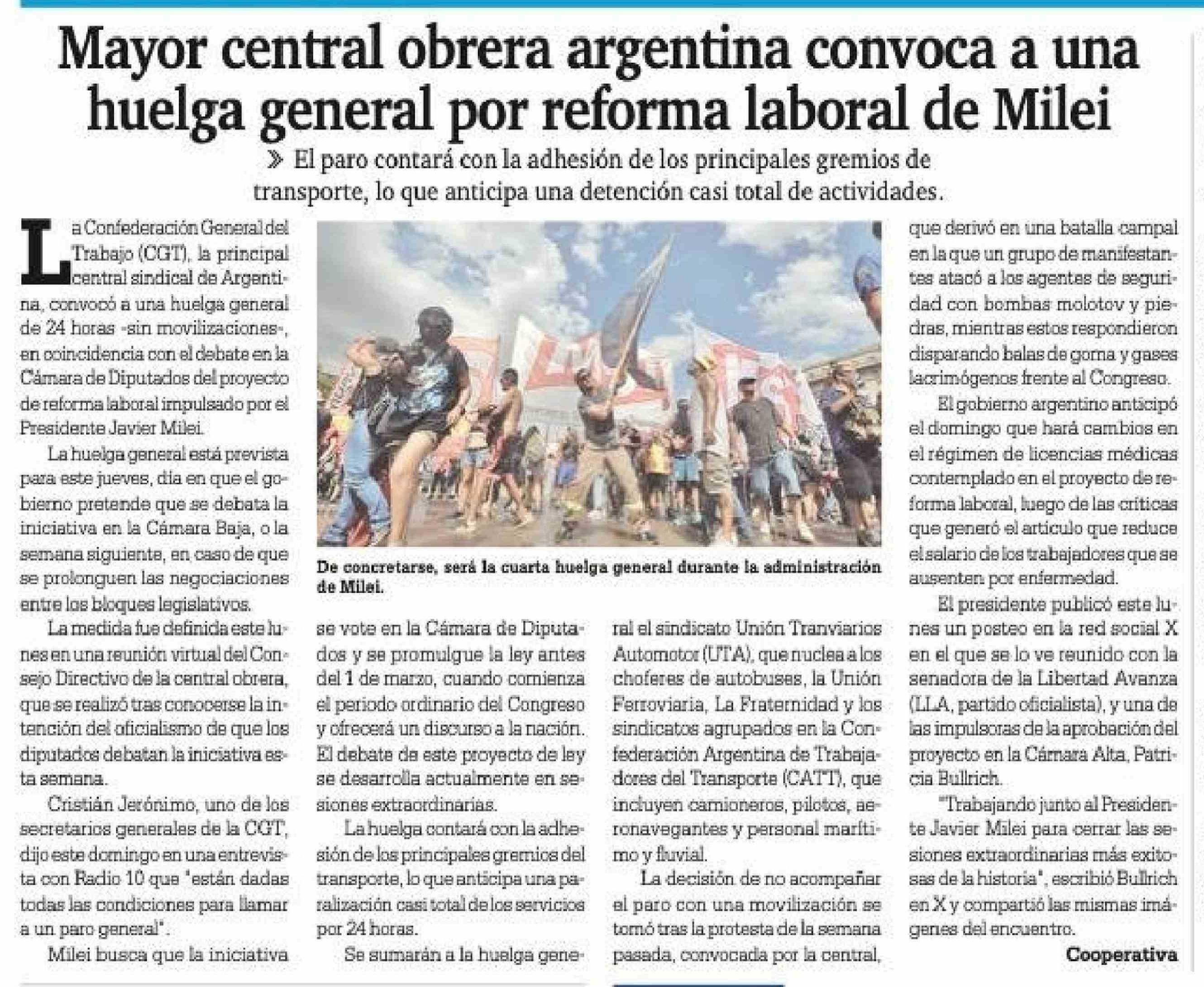 Mayor central obrera argentina convoca a una huelga general por reforma laboral de Milei